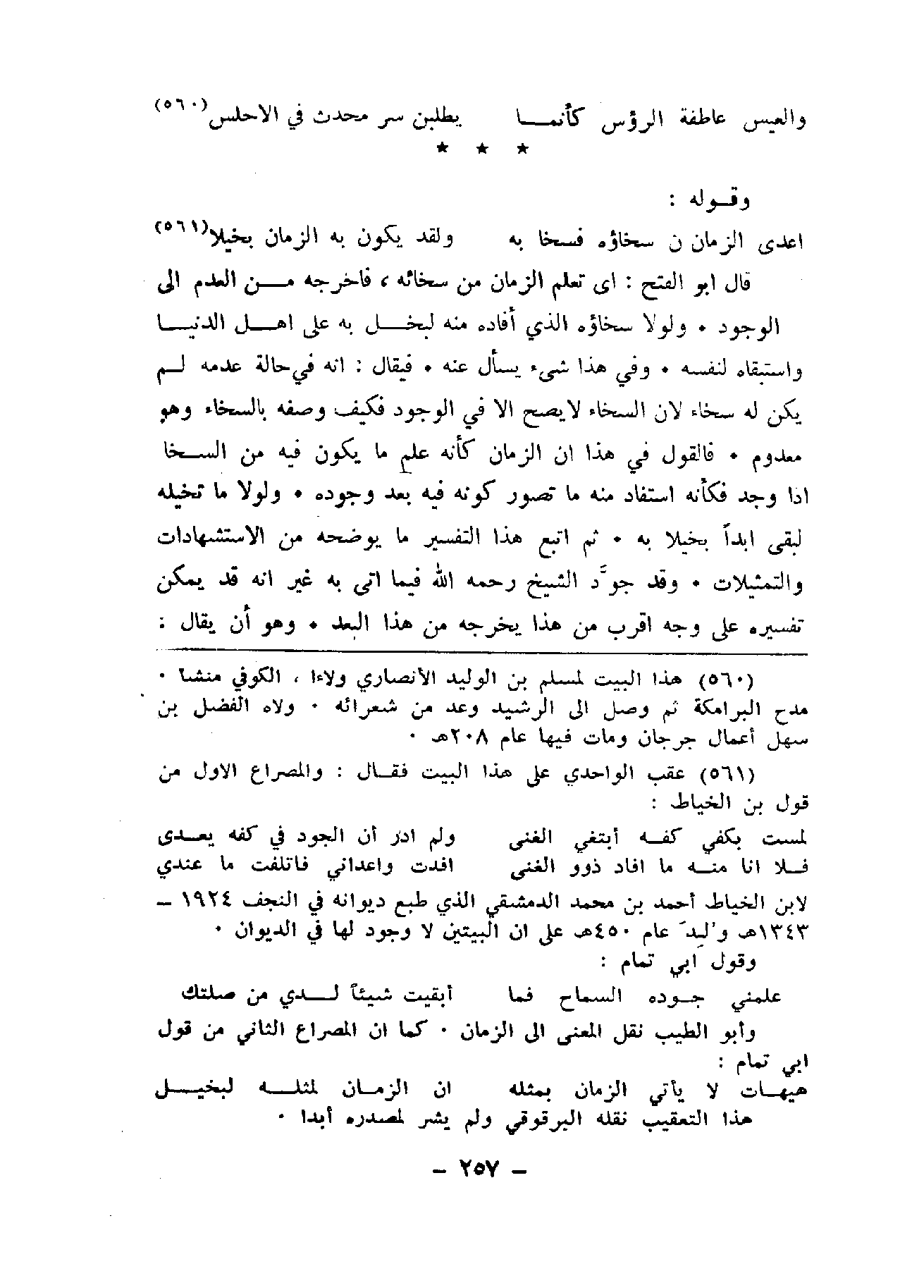 يسأل عنه. فيقال: إنه في حالة عدمه لم يكن له سخاء لأن السخاء لا يصح إلا في الوجود فكيف وصفه بالسخاء وهو معدوم. فالقول في هذا إن الزمان كأنه علم ما يكون فيه من السخا إذا وجد فكأنه استفاد منه ما تصور كونه فيه بعد وجوده. لولا ما تخيله لبقي أبداً بخيلا به. ثم اتبع هذا التفسير ما يوضحه من الاستشهادات والتمثيلات. وقد جود الشيخ رحمه الله فيما أتى به غير إنه قد يمكن تفسيره على وجه أقرب من هذا يخرجه من هذا البعد. وهو أن يقال: