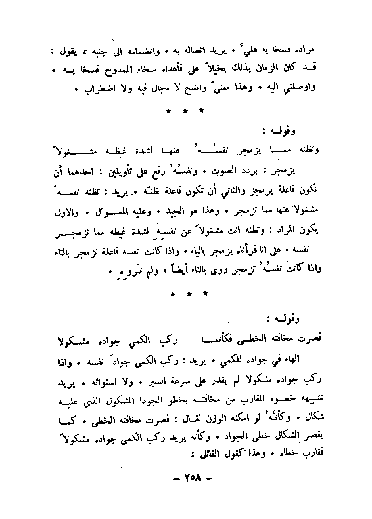 الهاء في جواده للكمي. يريد: ركب الكمي جواد نفسه. وإذا ركب جواده مشكولا لم يقدر على سرعة السير. ولا استوائه. يريد تشبيهه خطوة المقارب من مخافته بخطو الجواد المشكول الذي عليه شكال. وكأنه لو أمكنه الوزن لقال: قصرت مخافته الخطى. كما يقصر الشكال خطى الجواد. وكأنه يريد ركب الكمي جواده