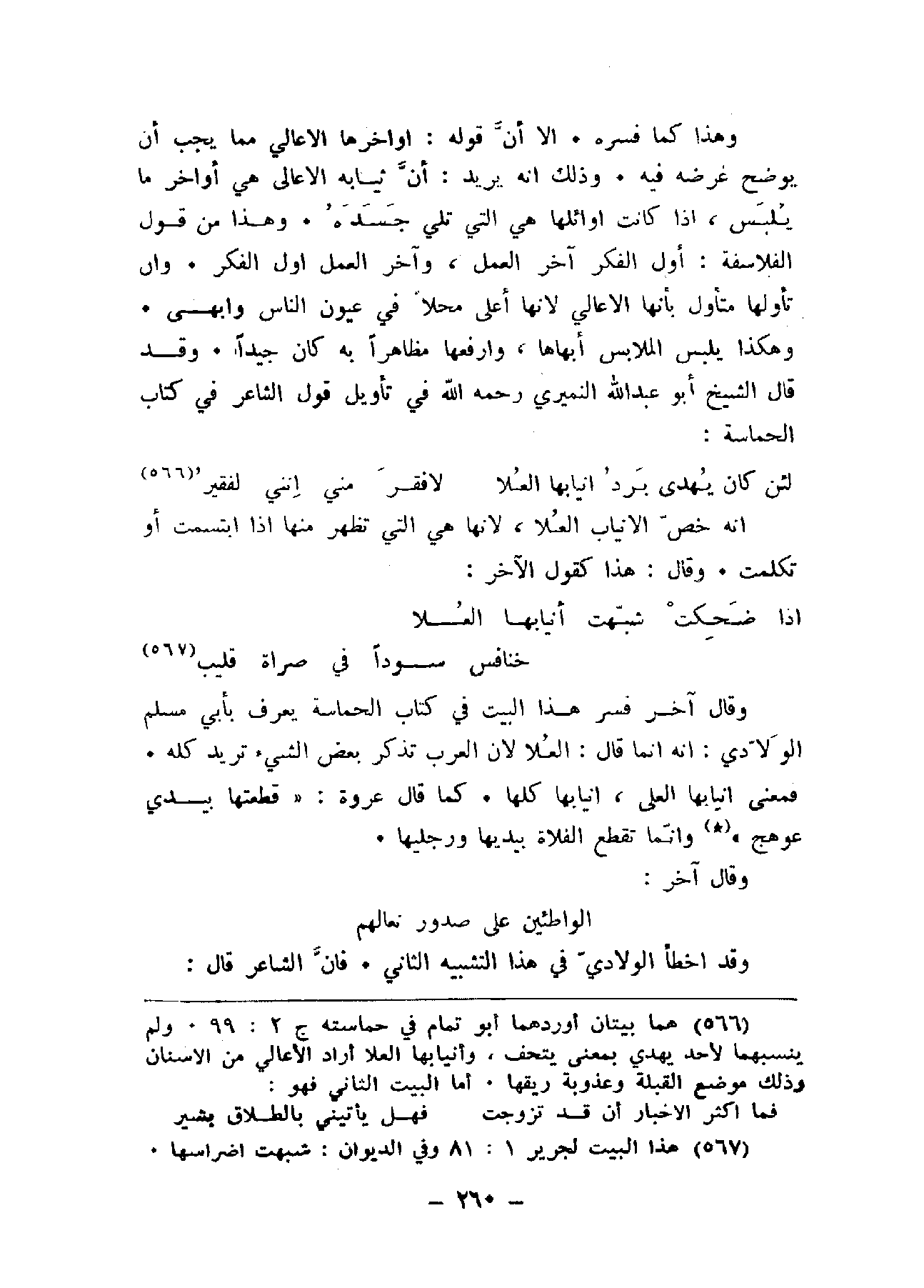 وقال آخر فسر هذا البيت في كتاب الحماسة يعرف بابي مسلم الولادي: إنه إنما قال: العلا لأن العرب تذكر بعض الشيء تريد كله. فمعنى أنيابها العلى، أنيابها كلها. كما قال عروة: (قطعتها بيدي عوهج) وإنما تقطع الفلاة بيديها ورجليها.