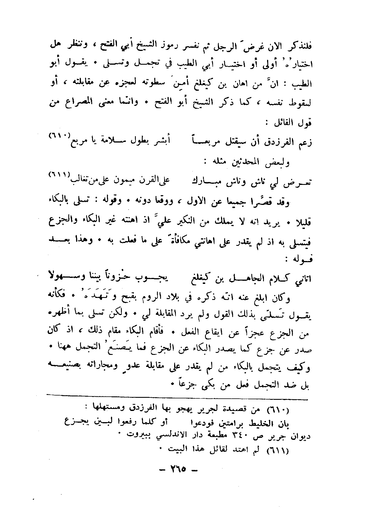وكان أبلغ عنه إنه ذكره في بلاد الروم بقبح وتهده. فكأنه يقول تسلى بذلك القول ولم يريد المقابلة لي. ولكن تسلى بما أظهره من الجزع عجزاً عن إيقاع الفعل. فأقام البكاء مقام ذلك، إذ كان صدر عن جزع كما يصدر البكاء عن الجزع فما يصنع التجمل هاهنا. وكيف يتجمل بالبكاء من لم يقدر على مقابلة عدو ومجاراته بصنيعه بل ضد التجمل فعل من بكى جزعاً.