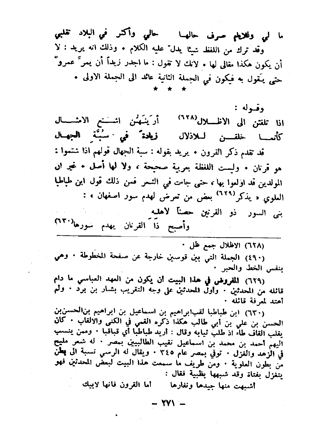 قد تقدم ذكر القرون. يريد بقوله: سبة الجهال قولهم إذا شتموا: هو قرنان. وليست اللفظة بعربية صحيحة، ولا لها أصل. غير أن المولدين قد أولعوا بها، حتى جاءت في الشعر فمن ذلك قول ابن طباطبا العلوي (يذكر بعض من تعرض لهدم