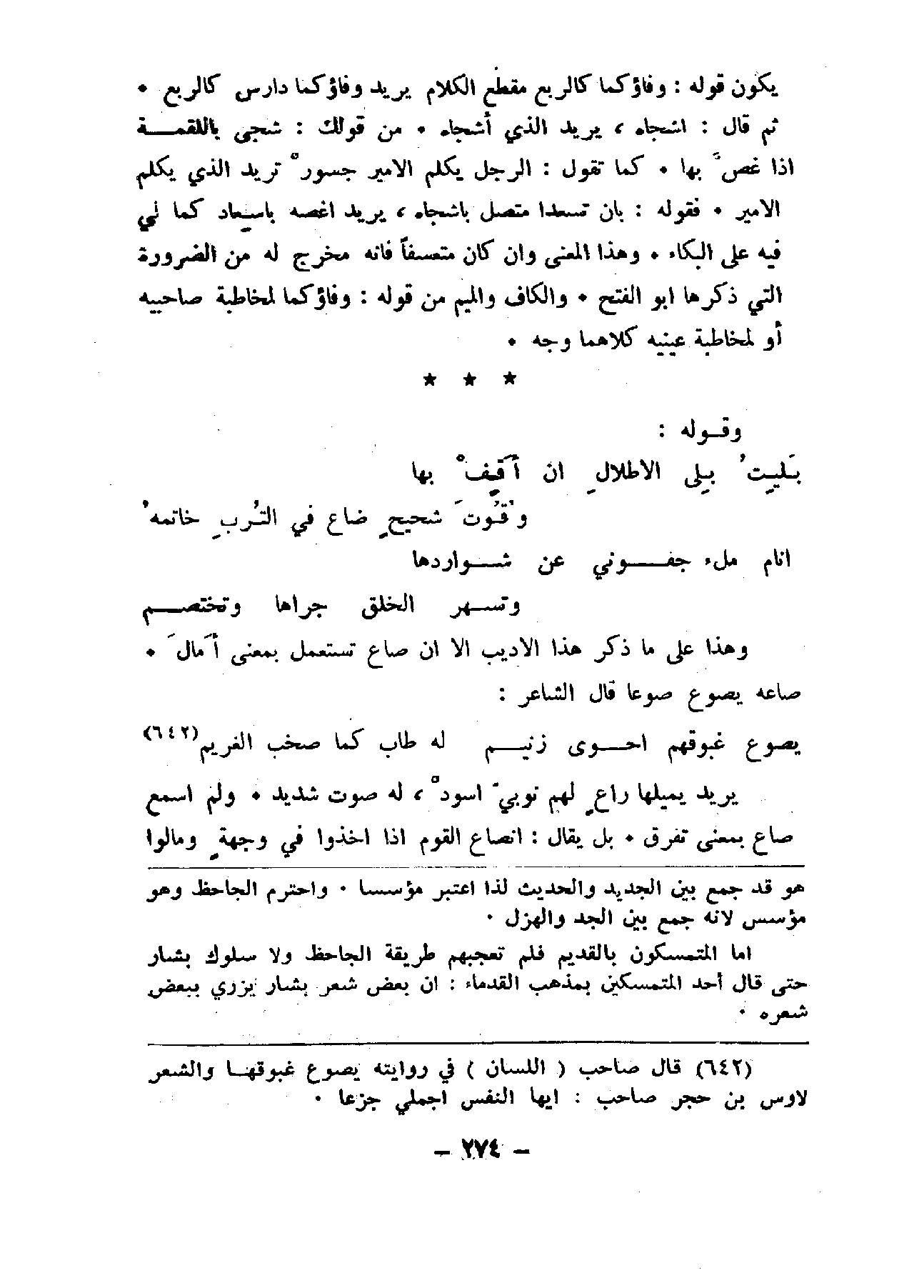 يكون قوله: وفاؤكما كالربع مقطع الكلام يريد وفاؤكما دارس كالربع ثم قال: أشجاه، يريد الذي أشجاه. من قولك: شجي باللقمة إذا غص بها. كما تقول: الرجل يكلم الأمير جسور تريد الذي يكلم الأمير. فقوله: بان تسعدا متصل بأشجاه، يريد أغصه بإسعاد كما لي فيه على البكاء. وهذا المعنى وإن كان متعسفاً فإنه مخرج له من الضرورة التي ذكرها أبو الفتح. والكاف والميم من قوله: وفاؤكما لمخاطبة صاحبيه أو لمخاطبة عينيه كلاهما وجه.