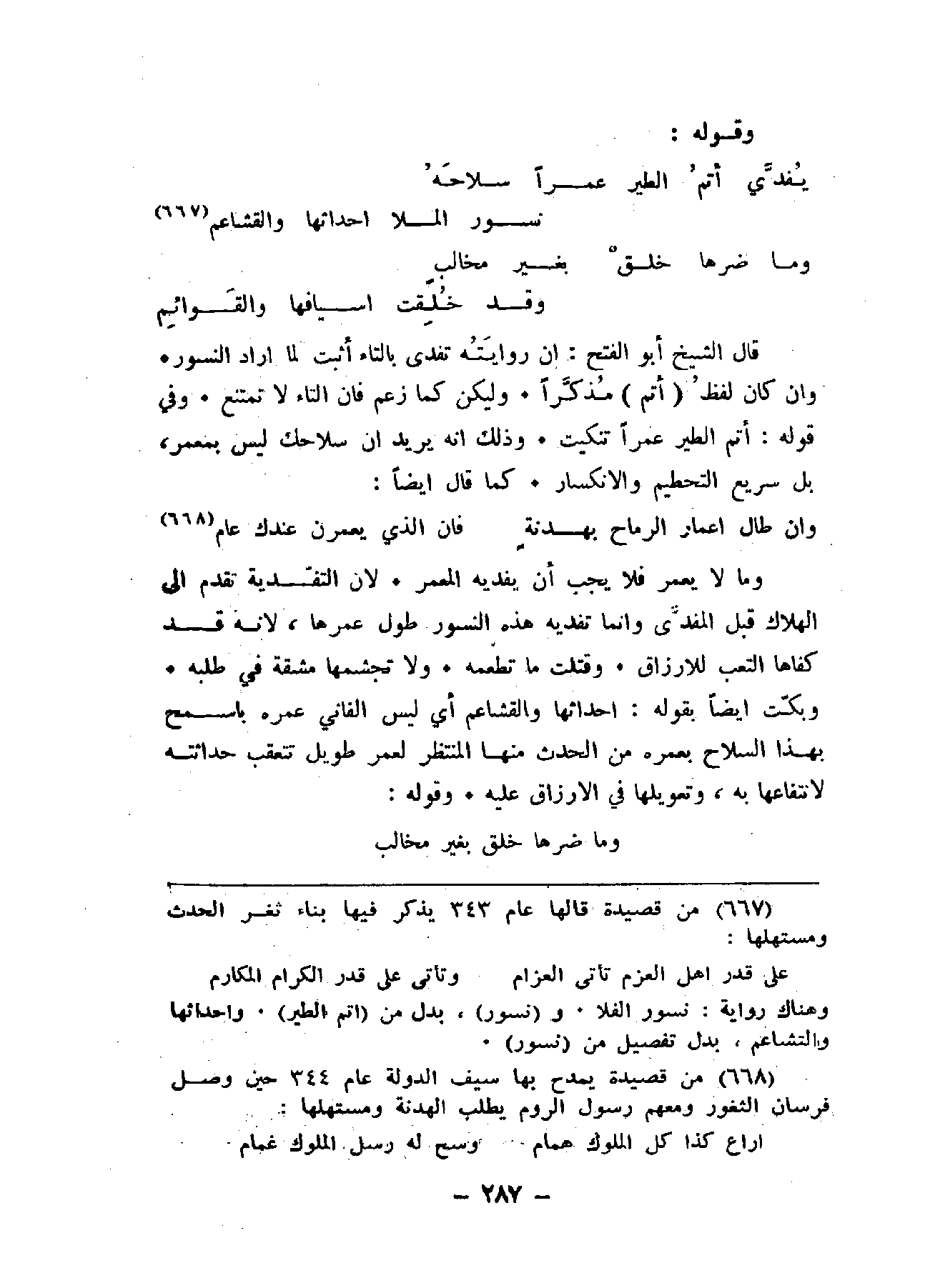 قال الشيخ أبو الفتح: إن روايته تفدى بالتاء أثبت لما أراد النسور. وإن كان لفظ (أتم) مذكراً. وليكن كما زعم فإن التاء لا تمتنع. وفي قوله: أتم الطير عمراً تنكيت. وذلك إنه يريد أن سلاحك ليس بمعمر، بل سريع التحطيم والانكسار. كما قال أيضاً: