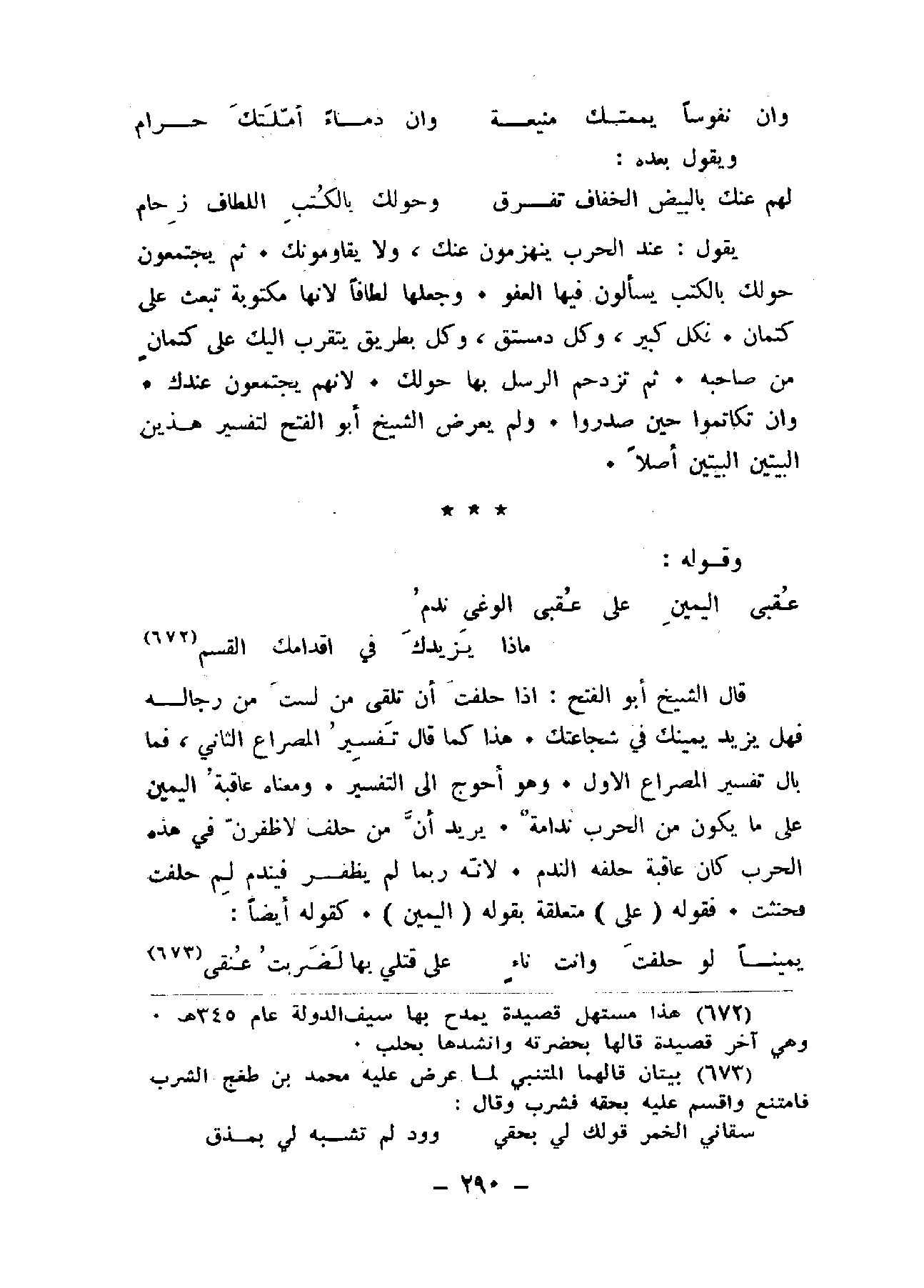 يقول: عند الحرب ينهزمون عنك، ولا يقاومونك. ثم يجتمعون حولك بالكتب يسألون فيها العفو. وجعلها لطافاً لأنها مكتوبة تبعث على كتمان. لكل كبير، وكل دمستق، وكل بطريق يتقرب إليك على كتمان من صاحبه. ثم تزدحم الرسل بها حولك. لأنهم يجتمعون عندك. وان تكاتموا حين صدروا. ولم يعرض الشيخ أبو الفتح لتفسير هذين البيتين أصلا.