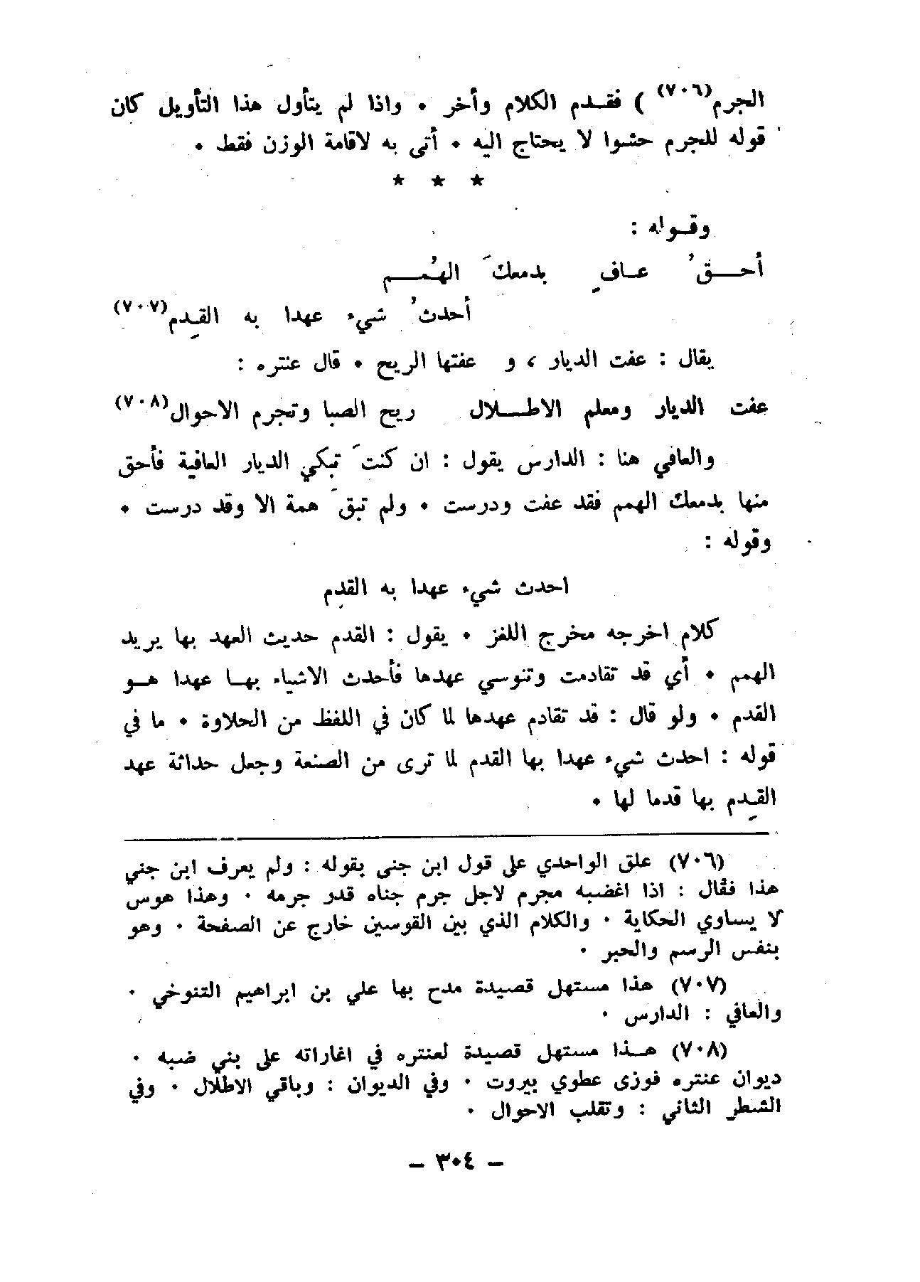 كلام أخرجه مخرج اللغز. يقول: القدم حديث العهد بها يريد الهمم. أي قد تقادمت وتنوسي عهدها فأحدث الأشياء بها عهداً هو القدم. ولو قال: قد تقادم عهدها لما كان في اللفظ من الحلاوة. ما في قوله: أحدث شيء عهدا بها القدم لما ترى من الصنعة وجعل حدائة عهد القدم بها قدماً لها.
