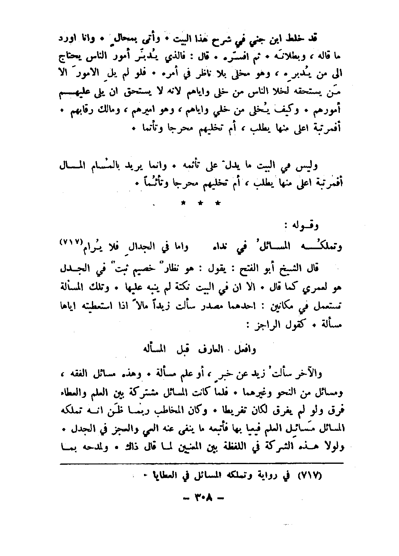 والآخر سألت زيد عن خبرٍ، أو علم مسألة. وهذه مسائل الفقه، ومسائل من النحو وغيرهما. فلما كانت المسائل مشتركة بين العلم والعطاء فرق ولو لم يفرق لكان تفريطاً. وكان المخاطب ربما ظن إنه تملكه المسائل مسائل العلم فيعيا بها فاتبعه ما ينفى عنه العي والعجز في الجدل. ولا هذه الشركة في اللفظة بين المعنيين لما قال ذاك. ولمدحه بما