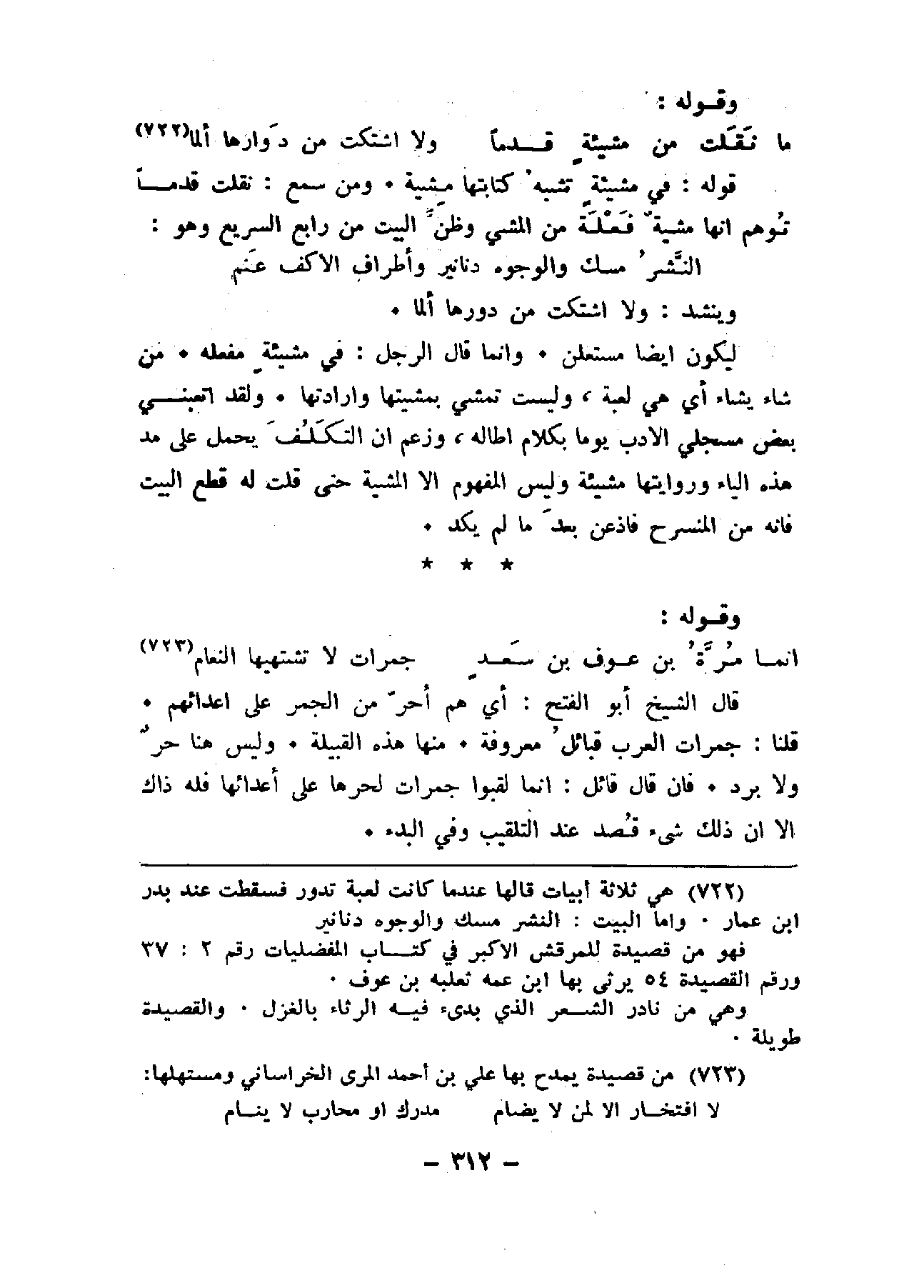 ليكون أيضاً مستعلن. وإنما قال الرجل: في ممشيئة مفعلة. من شاء يشاء أي هي لعبة، وليست تمشي بمشيتها وأرادتها. ولقد أتعبني بعض مسجلي الأدب يوما بكلام إطالة، وزعم أن التكلف يحمل على مد هذه الياء وروايتها مشيئة وليس المفهوم إلا المشية حتى قلت له قطع البيت فإنه من المنسرح فأذعن بعد ما لم يكد.
