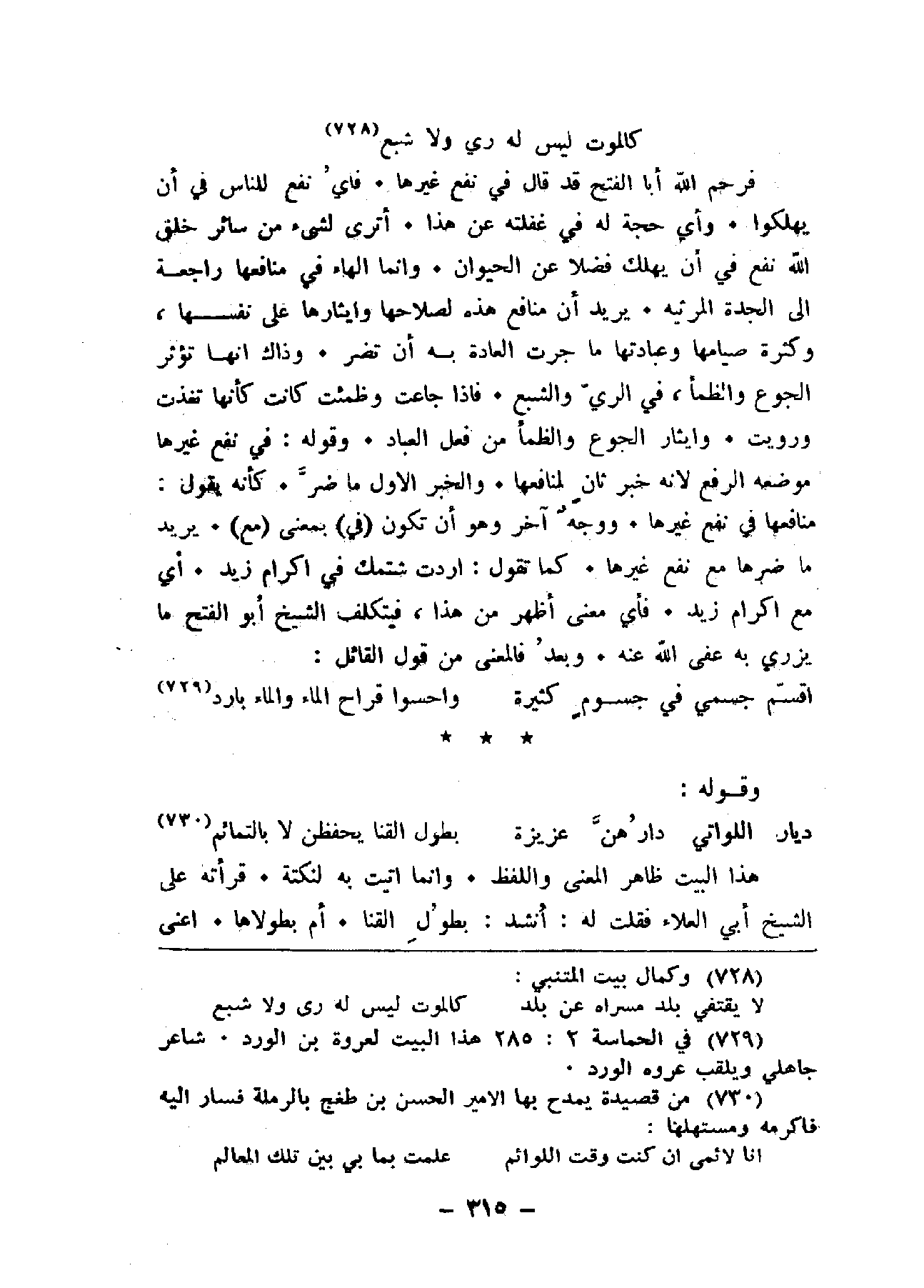 فرحم الله أبا الفتح قد قال في نفع غيرها. فأي نفع للناس في أن يهلكوا. وأي حجة له في غفلته عن هذا. أترى لشيء من سائر خلق الله نفع في أن يهلك فضلا عن الحيوان. وإنما الهاء في منافعها راجعة إلى الجدة المرثية. يريد أن منافع هذه لصلاحها وإيثارها على نفسها، وكثرة صيانها وعبادتها ما جرت العادة به أن تضر. وذاك أنها تؤثر الجوع والظمأ، في الري والشبع. فإذا جاعت وظمئت كانت كأنها تغذت ورويت. وإيثار الجوع والظمأ من فعل العباد. وقوله: في نفع غيرها موضعه الرفع لأنه خبر ثان لمنافعها. والخبر الأول ما ضرَّ. كأنه يقول: منافعها في نفع غيرها. ووجه آخر وهو أن تكون (في) بمعنى (مع). يريد ما ضرها مع نفع غيرها. كما تقول: أردت شتمك في إكرام زيد. أي مع إكرام زيد. فأي معنى أظهر من هذا، فيتكلف الشيخ أبو الفتح ما يزري به عفى الله عنه. وبعد فالمعنى من قول القائل:
