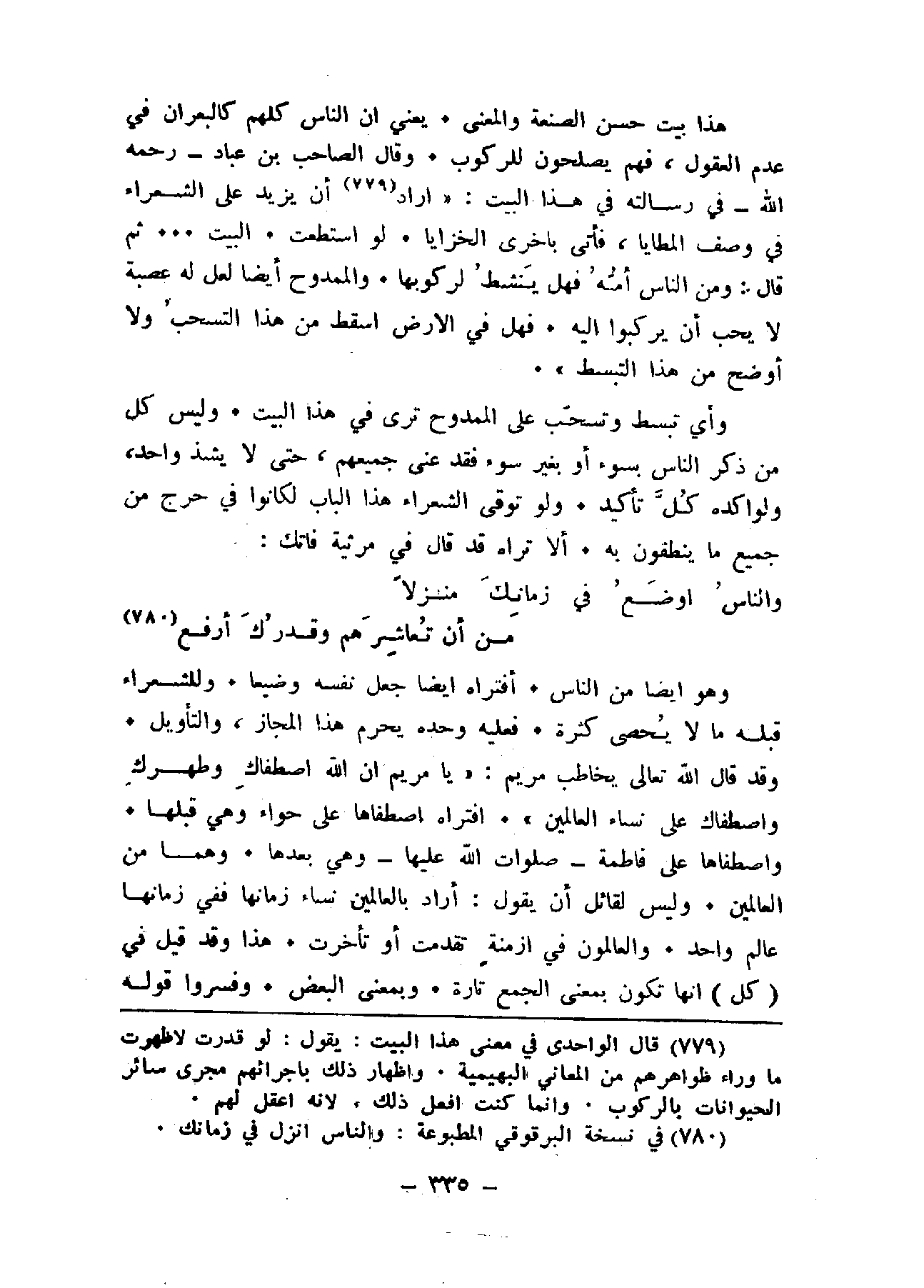 وهو أيضاً من الناس. أفتراه أيضا جعل نفسه وضيعا. وللشعراء قبله ما لا يحصى كثره. فعليه وحده يحرم هذا المجاز، والتأويل. وقد قال الله تعالى يخاطب مريم: (يا مريم إن الله اصطفاك وطهرك واصطفاك على نساء العالمين). أفتراه اصطفاها على حواء وهي قبلها. واصطفاها على فاطمة - صلوات الله عليها - وهي بعدها. وهما من العالمين. وليس لقائل أن يقول: أراد بالعالمين نساء زمانها ففي زمانها عالم واحد. والعالمون في أزمنة تقدمت أو تأخرت. هذا وقد قيل في (كل) إنها تكون بمعنى الجمع تارة. وبمعنى البعض. وفسروا قوله