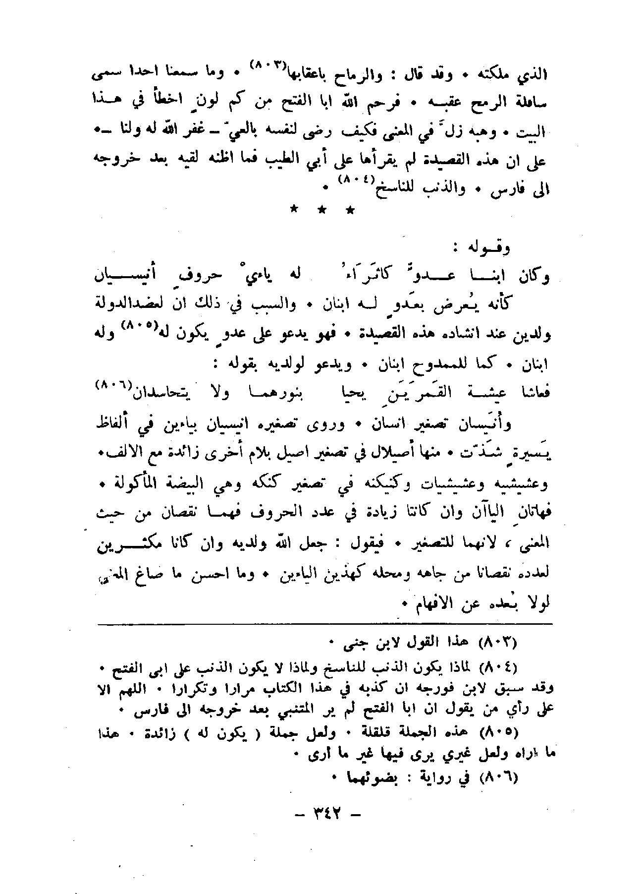 وانيسان تصغير إنسان. وروى تصغيره انيسيلن بياءين في ألفاظ يسيرة شذت. منها اصيلال في تصغير أصيل بلام أخرى زائدة مع الألف. وعشيشيه وعشيشيات وكنيكنه في تصغير كنكه وهي البيضة المأكولة. فهاتان إليان وإن كانتا زيادة في عدد الحروف فهما نقصان من حيث المعنى، لأنهما للتصغير. فيقول: جعل الله ولديه وإن كانا مكثرين لعدده نقصانا من جاهه ومحله كهذين اليائين. وما احسن ما صاغ لولا بهده عن الإفهام.