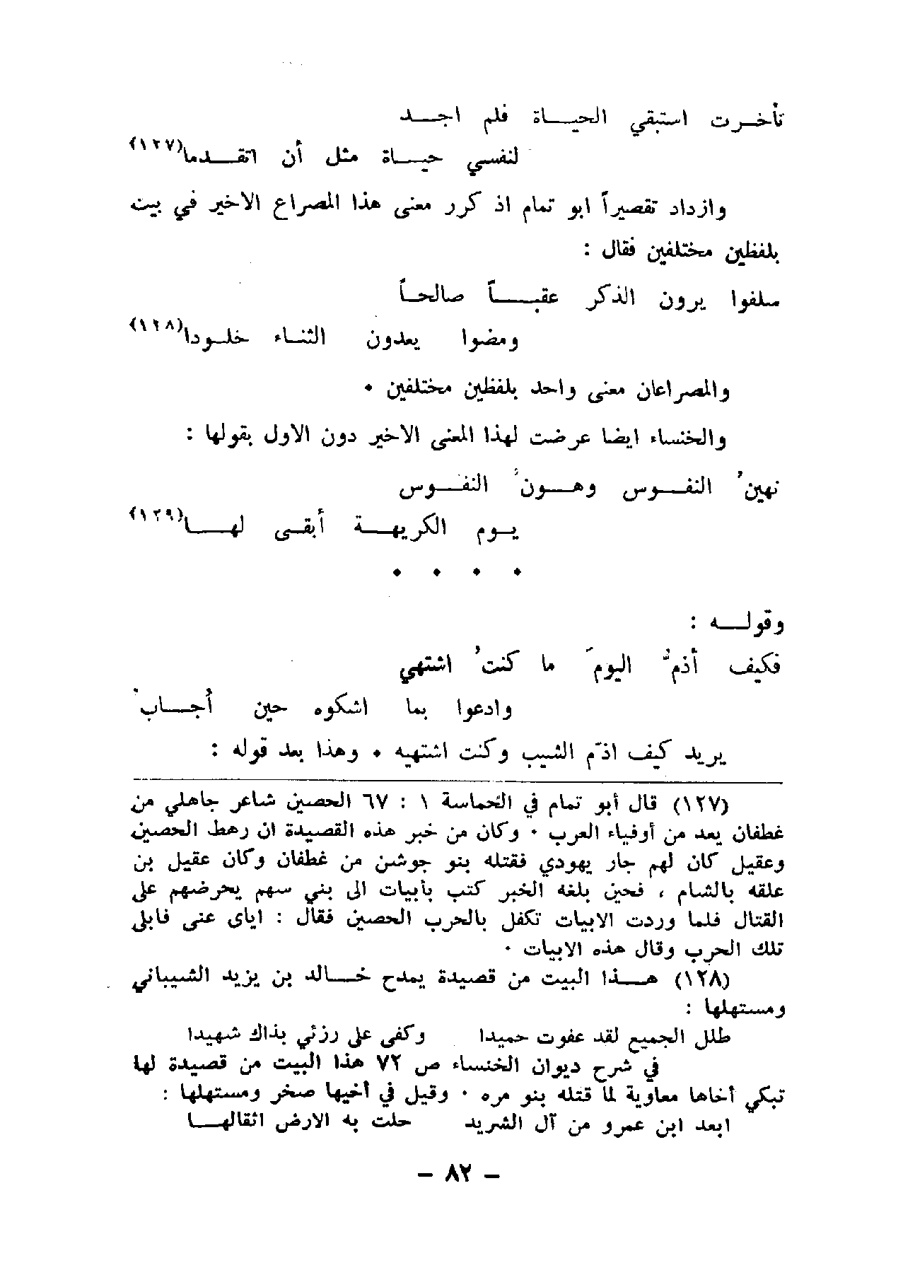 وازداد تقصيراً أبو تمام إذ كرر معنى هذا المصراع الأخير في بيت بلفظين مختلفين فقال:
