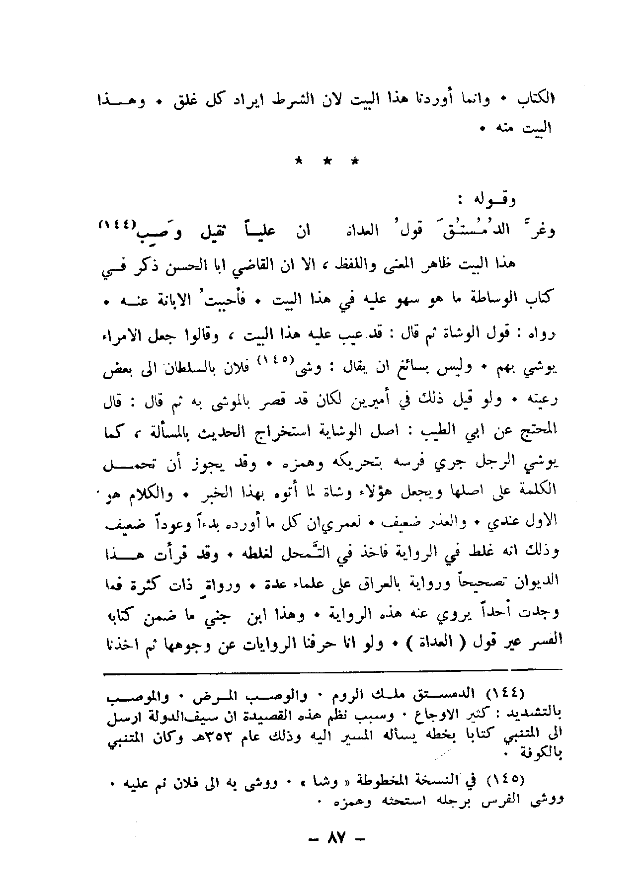 هذا البيت ظاهر المعنى واللفظ، إلا أن القاضي أبا الحسن ذكر في كتاب الوساطة ما هو سهو عليه في هذا البيت. فأحببت الإبانة عنه. رواه: قول الوشاة ثم قال: عيب عليه هذا البيت. وقالوا جعل الأمراء يوشي بهم. وليس بسائغ أن يقال: وشى فلان بالسلطان إلى بعض رعيته. ولو قيل ذلك في أميرين لكان قد قصر بالموشى به ثم قال: قال المحتج عن أبي الطيب: اصل الوشاية استخراج الحديث بالمسألة، كما يوشي الرجل جرى فرسه بتحريكه وهمزة. وقد يجوز أن تحمل الكلمة على اصلها ويجعل هؤلاء وشاة لما أتوه بهذا الخبر. والكلام هو الأول عندي. والعذر ضعيف. لعمري أن كل ما أورده بدءاً وعوداً ضعيف وذلك إنه غلط في الرواية فأخذ في التَّمحل لغلطه. وقد قرأت هذا الديوان تصحيحاً ورواية بالعراق على