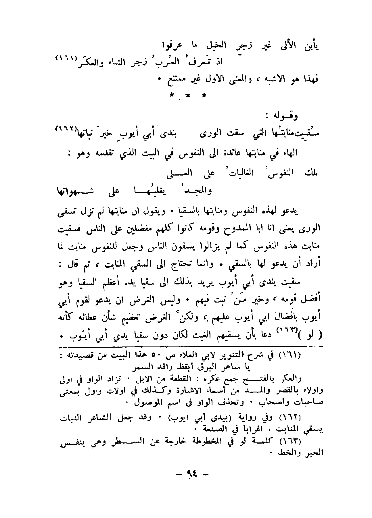يدعو لهذه النفوس ومنابتها بالسقيا. ويقول أن منابتها لم تزل تسقى الورى يعني أنا أبا الممدوح وقومه كانوا كلهم مفضلين على الناس فسقيت منابت هذه النفوس كما لم يزالوا يسقون الناس وجعل للنفوس منابت لما أراد أن يدعو لها بالسقي. وإنما تحتاج إلى السقي المنابت، ثم قال: