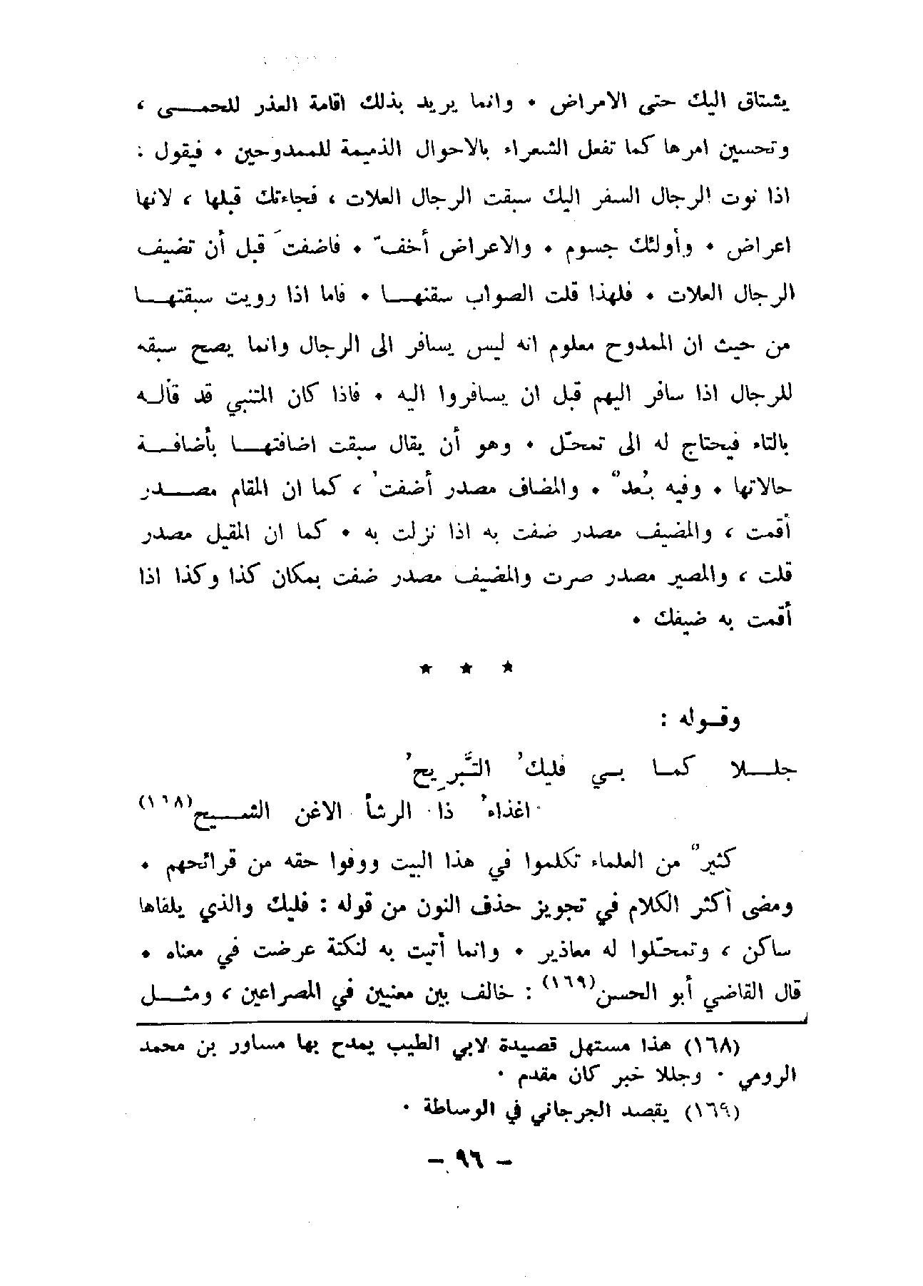 يشتاق إليك حتى الأمراض. وإنما يريد بذلك إقامة العذر للحمى، وتحسين أمرها كما تفعل الشعراء بالأحوال الذميمة للممدوحين. فيقول: إذا نوت الرجال السفر إليك سبقت إليك الرجال العلات، فجاءتك قبلها، لأنها أعراض. وأولئك جسوم. والأعراض أخف. فأضفت قبل أن تضيف الرجال العلات. فلهذا قلت الصواب سقنها. فأما إذا رويت سبقتها من حيث أن الممدوح معلوم إنه ليس يسافر إلى الرجال وإنما يصح سبقه للرجال إذا سافر إليهم قبل أن يسافروا إليه. فإذا كان المتنبي قد قاله بالتاء فيحتاج له إلى تمحل. وهو أن يقال سبقت أضافتها بإضافة حالاتها. وفيه بُعدٌ. والمضاف مصدر أضفت، كما أن المقام مصدر أقمت، والمضيف مصدر ضفت به إذا نزلت به. كما أن المقيل مصدر قلت، والمصير مصدر صرت والمضيف مصدر صفت بمكان كذا وكذا إذا أقمت به ضيفك.