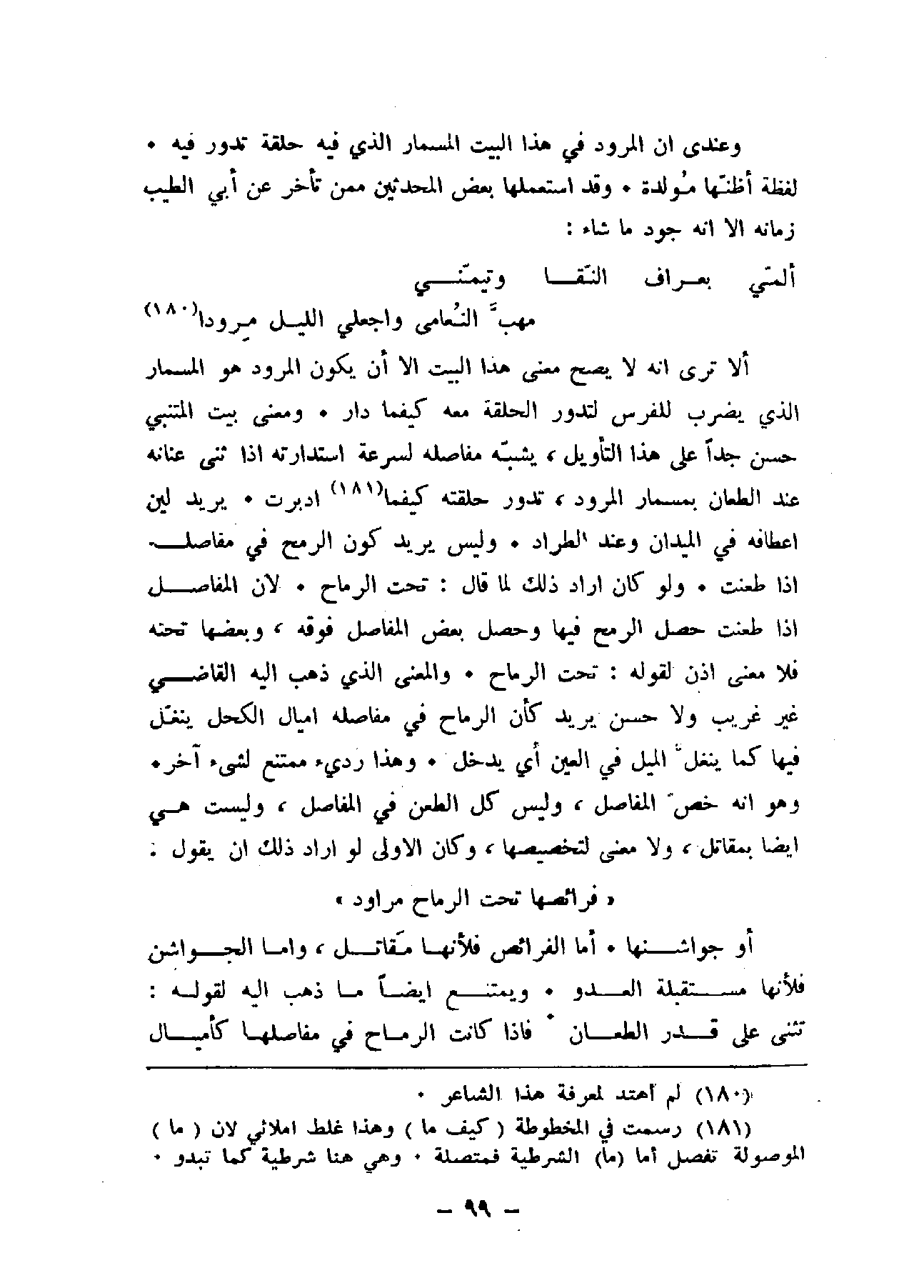 ألا ترى إنه لا يصح معنى هذا البيت إلا أن يكون المرود هو المسمار الذي يضرب للفرس لتدور الحلقة معه كيفما دار. ومعنى بيت المتنبي حسن جداً على هذا التأويل، يشبه مفاصله لسرعة استدارته إذا ثنى عنانه عند الطعان بمسمار المرود، تدور حلقته كيفما أدبرت. يريد لين أعطافه في الميدان وعند الطراد. وليس يريد كون الرمح في مفاصله إذا طعنت. ولو كان أراد ذلك لما قال: تحت الرماح. لأن المفاصل إذا طعنت حصل الرمح فيها وحص بعض المفاصل فوقه، وبعضها تحته فلا معنى إذن لقوله: تحت الرماح. والمعنى الذي ذهب إليه القاضي غير غريب ولا حسن يريد كأن الرماح في مفاصله أميال الكحل ينغل فيها كما ينغل الميل في العين أي يدخل. وهذا رديء ممتنع لشيء آخر. وهو إنه خص المفاصل، وليس كل الطعن في المفاصل، وليست هي أيضاً بمقاتل، ولا معنى لتخصيصها، وكان الأولى لو أراد ذلك أن يقول: