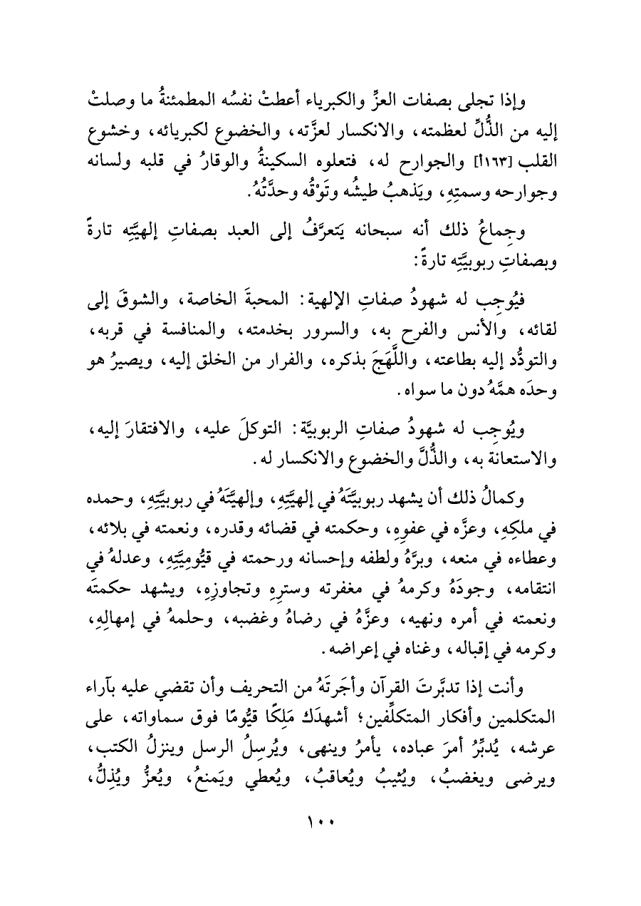 وكمالُ ذلك أن يشهد ربوبيَّتَهُ في إلهيَّتِهِ، وإلهيَّتَهُ في ربوبيَّتِهِ، وحمده في ملكِهِ، وعزَّه في عفوهِ، وحكمته في قضائه وقدره، ونعمته في بلائه، وعطاءه في منعه، وبرَّهُ ولطفه وإحسانه ورحمته في قيُّومِيَّتِهِ، وعدلهُ في انتقامه، وجودَهُ وكرمهُ في مغفرته وسترِهِ وتجاوزِهِ، ويشهد حكمتَه ونعمته في أمره ونهيه، وعزَّهُ في رضاهُ وغضبه، وحلمهُ في إمهالِهِ، وكرمه في إقباله، وغناه في إعراضه.