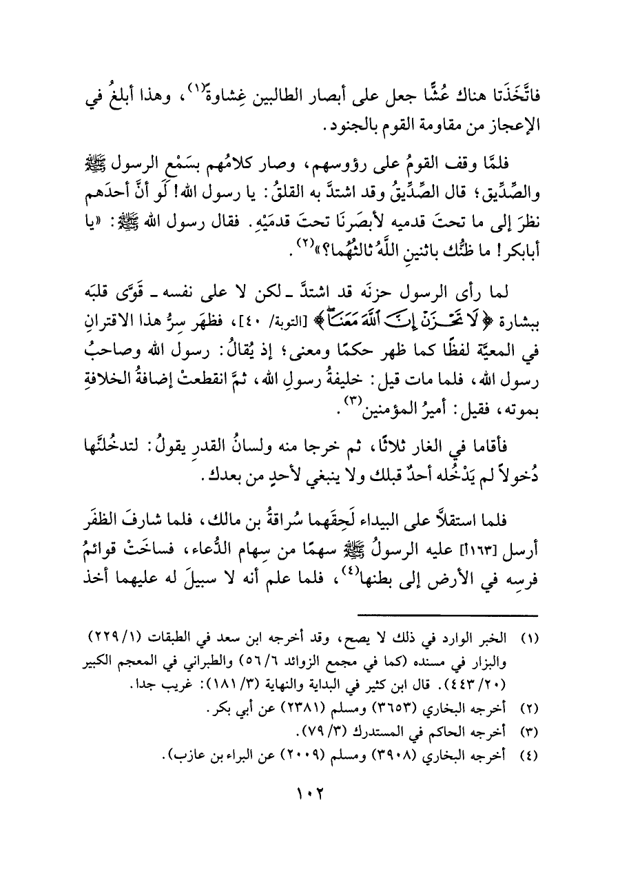 فلمَّا وقف القومُ على رؤوسهم، وصار كلامُهم بسَمْعِ الرسول -صلى الله عليه وسلم- والصِّدِّيق؛ قال الصِّدِّيقُ وقد اشتدَّ به القلقُ: يا رسول الله! لَو أنَّ أحدَهم نظرَ إلى ما تحتَ قدميه لأبصَرنَا تحتَ قدمَيْهِ. فقال رسول الله -صلى الله عليه وسلم-: "يا أبا بكر! ما ظنُّك باثنينِ اللهُ ثالثُهُما؟ " (¬٢) .