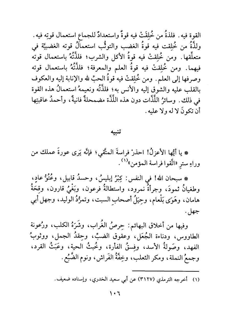 القوة فيه. فلذةُ من خُلِقَتْ فيه قوةٌ واستعدادٌ للجماع استعمال قوتِه فيه. ولذَّةُ من خُلِقت فيه قوةُ الغضب والتوثُّب استعمالُ قوته الغضبيَّة في متعلَّقها. ومن خُلِقتْ فيه قوةُ الأكل والشرب؛ فلذَّتُهُ باستعمال قوته فيهما. ومن خُلِقتْ فيه قوةُ العلم والمعرفة؛ فلذَّتُهُ باستعمال قوته وصرفها إلى العلم. ومن خُلِقتْ فيه قوةُ الحبِّ لله والإنابة إليه والعكوف بالقلب عليه والشوق إليه والأنس به؛ فلذتُه ونعيمهُ استعمالُ هذه القوة في ذلك. وسائرُ اللَّذَّات دون هذه اللَّذَّة مضمحلةٌ فانيةٌ، وأحمدُ عاقبتِها أن تكونَ لا له ولا عليه.
