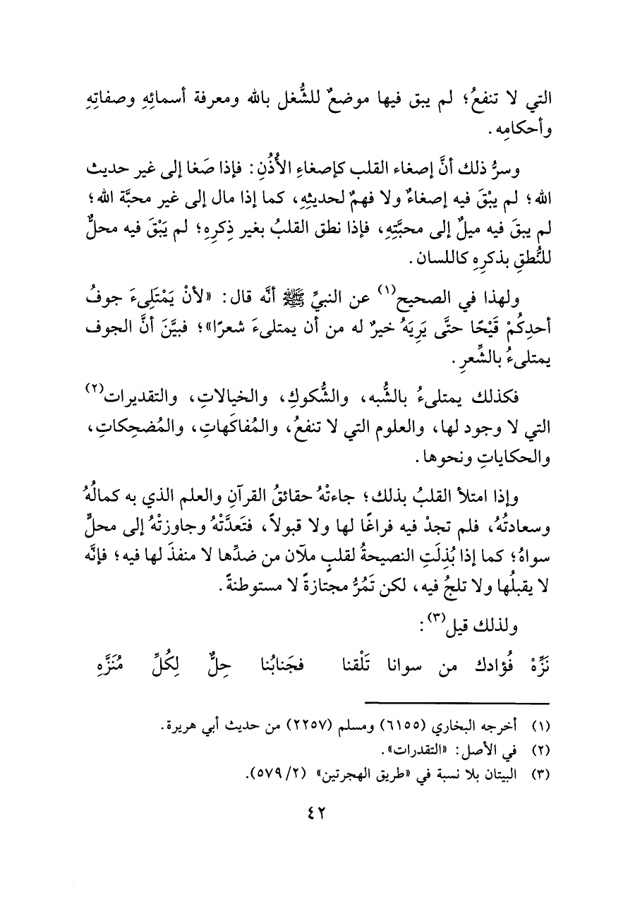 وإذا امتلأ القلبُ بذلك؛ جاءتْهُ حقائقُ القرآنِ والعلم الذي به كمالُهُ وسعادتُهُ، فلم تجدْ فيه فراغًا لها ولا قبولًا، فتَعدَّتْهُ وجاوزتْهُ إلى محلٍّ سواهُ؛ كما إذا بُذِلَتِ النصيحةُ لقلبٍ ملآن من ضدِّها لا منفذَ لها فيه؛ فإنَّه لا يقبلُها ولا تلجُ فيه، لكن تَمُرُّ مجتازةً لا مستوطنةً.