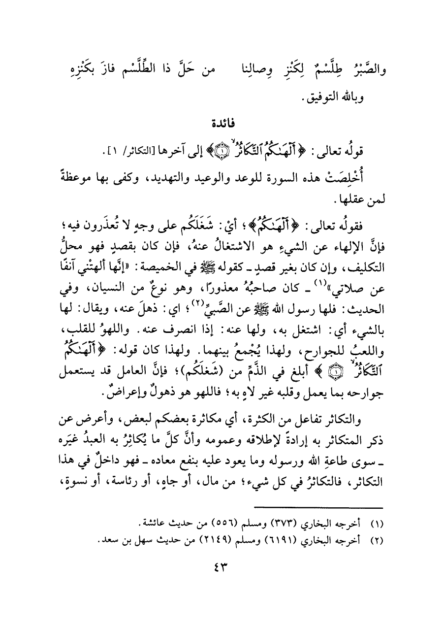 فقولُه تعالى: {أَلْهَاكُمُ}؛ أي: شَغَلَكُم على وجهٍ لا تُعذَرون فيه؛ فإنَّ الإلهاء عن الشيءِ هو الاشتغالُ عنهُ، فإن كان بقصدٍ فهو محلُّ التكليف، وإن كان بغير قصدٍ -كقوله -صلى الله عليه وسلم- في الخميصة: "إنَّها ألهتْني آنفًا عن صلاتي" (¬١) - كان صاحبُهُ معذورًا، وهو نوعٌ من النسيان، وفي الحديث: فلها رسول الله -صلى الله عليه وسلم- عن الصَّبيِّ (¬٢)؛ أي: ذهلَ عنه، ويقال: لها بالشيء أي: اشتغل به، ولها عنه: إذا انصرف عنه. واللهوُ للقلب، واللعبُ للجوارح، ولهذا يُجْمعُ بينهما. ولهذا كأنه قوله: {أَلْهَاكُمُ التَّكَاثُرُ (١)} أبلغ في الذَّمِّ من (شَغلَكُم)؛ فإنَّ العامل قد يستعمل جوارحه بما يعمل وقلبه غير لاهٍ به؛ فاللهو هو ذهولٌ وإعراضٌ.