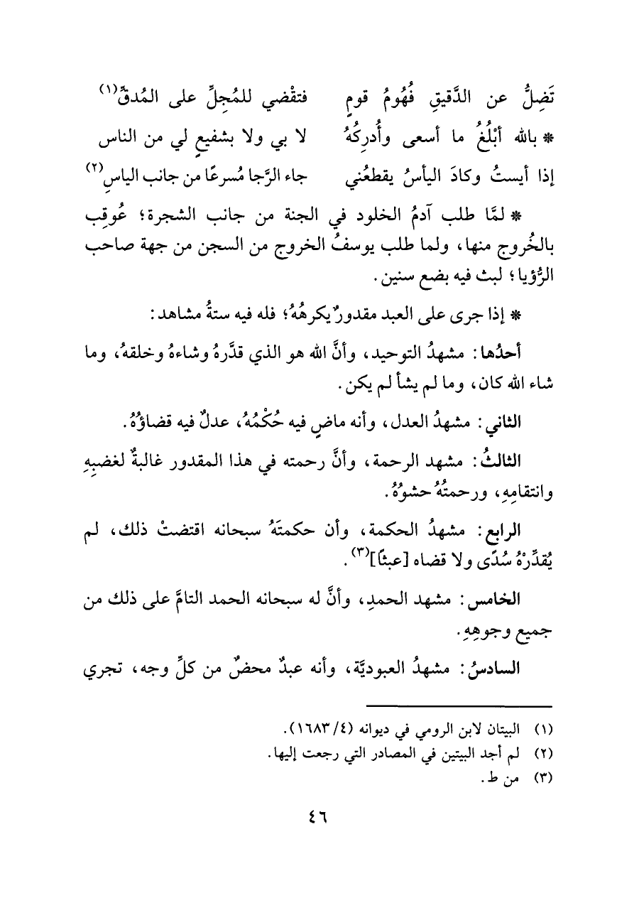 • إذا جرى على العبد مقدورٌ يكرهُهُ؛ فله فيه ستةُ مشاهد: