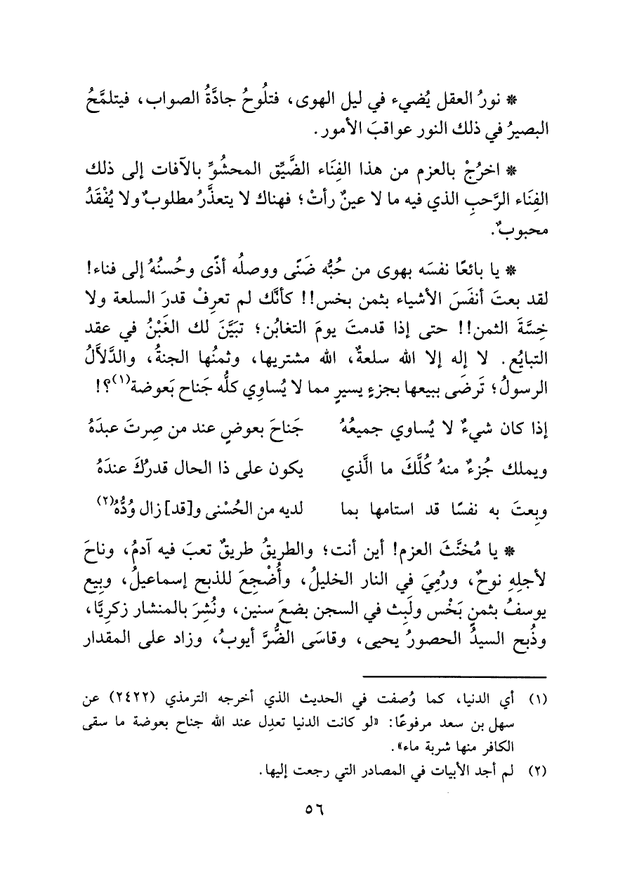• يا مُخنَّثَ العزم! أين أنت؛ والطريقُ طريقٌ تعبَ فيه آدمُ، وناحَ لأجلِهِ نوحٌ، ورُمِيَ في النار الخليلُ، وأُضْجِعَ للذبح إسماعيلُ، وبِيع يوسفُ بثمنٍ بَخْس ولَبِث في السجن بضعَ سنين، ونُشِرَ بالمنشار زكرِيَّا، وذُبح السيدُ الحصورُ يحيى، وقاسَى الضُّرَّ أيوبُ، وزاد على المقدار