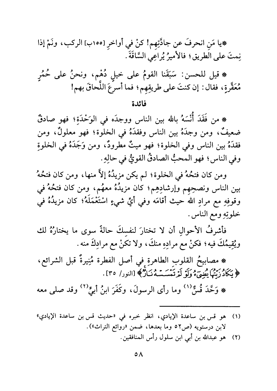 • من فَقَدَ أُنْسَهُ بالله بين الناس ووجدَه في الوَحْدَةِ؛ فهو صادقٌ ضعيفٌ، ومن وجدَهُ بين الناس وفقدَهُ في الخلوة؛ فهو معلولٌ، ومن فقدَهُ بين الناس وفي الخلوة؛ فهو ميتٌ مطرودٌ، ومن وَجَدَهُ في الخلوةِ وفي الناس؛ فهو المحبُّ الصادقُ القويُّ في حالِهِ.