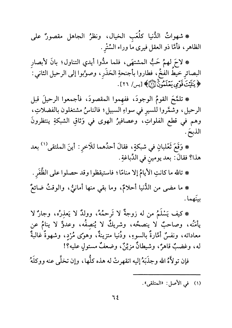 • تلمَّحَ القومُ الوجودَ، ففهِموا المقصودَ، فأجمعوا الرحيلَ قبل الرحيل، وشمَّروا للسيرِ في سواءِ السبيل؛ فالناسُ مشتغلون بالفضلاتِ، وهم في قطع الفلواتِ، وعصافيرُ الهوى في وَثاقِ الشبكةِ ينتظرونَ الذبحَ.