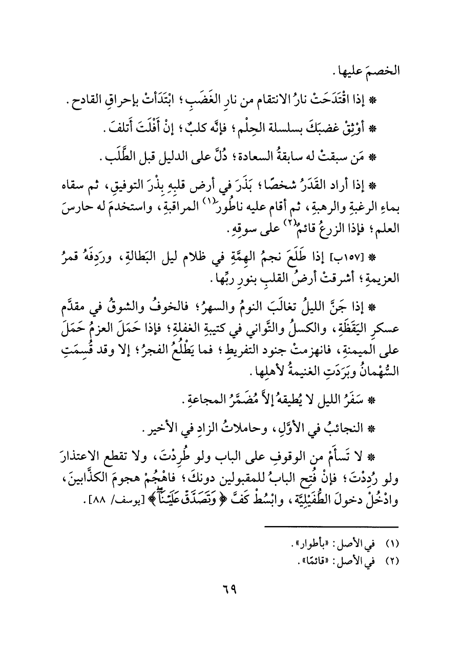 • إذا جَنَّ الليلُ تغالبَ النومُ والسهرُ؛ فالخوفُ والشوقُ في مقدَّم عسكرِ اليَقَظَةِ، والكسلُ والتَّواني في كتيبةِ الغفلةِ؛ فإذا حَمَلَ العزمُ حَمَلَ على الميمنةِ، فانهزمتْ جنود التفريطِ؛ فما يَطْلُعُ الفجرُ؛ إلا وقد قُسِمَتِ السُّهْمانُ وبَرَدَتِ الغنيمةُ لأهلِها.