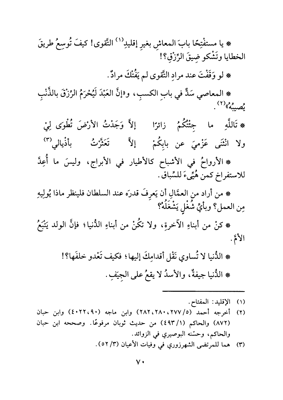 • يا مستفْتِحًا بابَ المعاشِ بغيرِ إقليدِ (¬١) التَّقوى! كيفَ تُوسِعُ طريقَ الخطايا وتَشْكو ضِيقَ الرِّزْقِ؟!