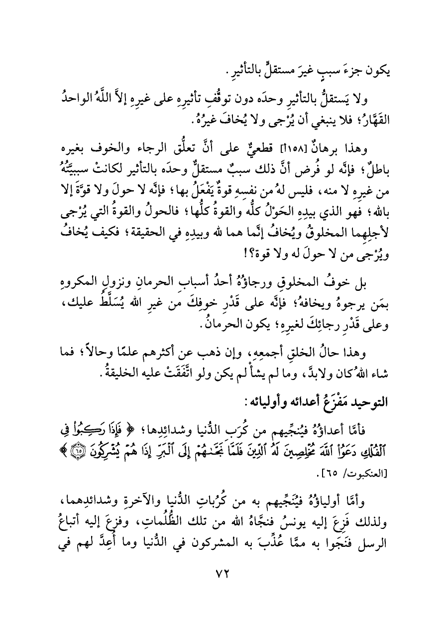 وهذا برهانٌ قطعيٌّ على أنَّ تعلُّق الرجاء والخوف بغيره باطلٌ؛ فإنَّه لو فُرض أنَّ ذلك سببٌ مستقلٌّ وحدَه بالتأثير لكانتْ سببيَّتُهُ من غيرِهِ لا منه، فليس لهُ من نفسِهِ قوةٌ يَفْعَلُ بها؛ فإنَّه لا حولَ ولا قوَّةَ إلا بالله؛ فهو الذي بيدِهِ الحَوْلُ كلُّه والقوةُ كلُّها؛ فالحولُ والقوةُ التي يُرْجى لأجلِهِما المخلوقُ ويُخافُ إنَّما هما لله وبيدِهِ في الحقيقة؛ فكيف يُخافُ ويُرْجى من لا حولَ له ولا قوة؟!
