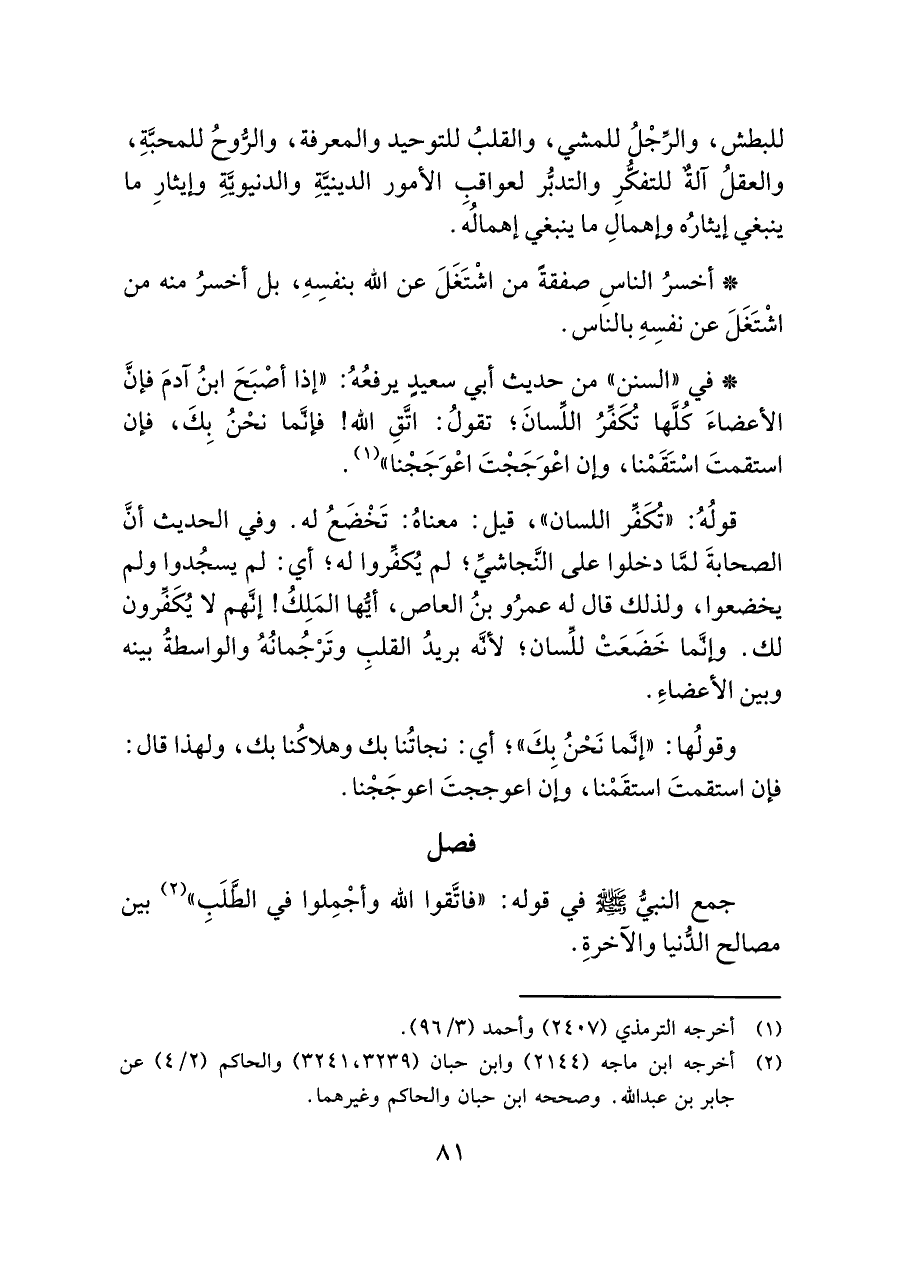 • في "السنن" من حديث أبي سعيدٍ يرفعُهُ: "إذا أصْبَحَ ابنُ آدمَ فإنَّ الأعضاءَ كُلَّها تكَفِّرُ اللِّسانَ؛ تقولُ: اتَّقِ الله! فإنَّما نحْنُ بكَ، فإنَّ استقمتَ اسْتَقَمْنا، وإن اعْوَجَجْتَ اعْوَجَجْنا" (¬١).