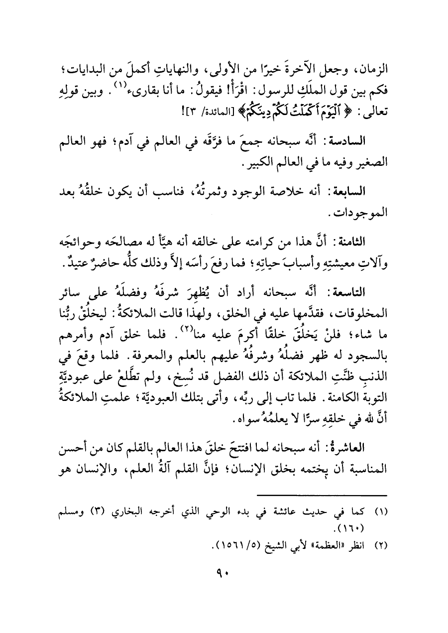 السابعة: أنه خلاصة الوجود وثمرتُهُ، فناسب أن يكون خلقُهُ بعد الموجودات.
