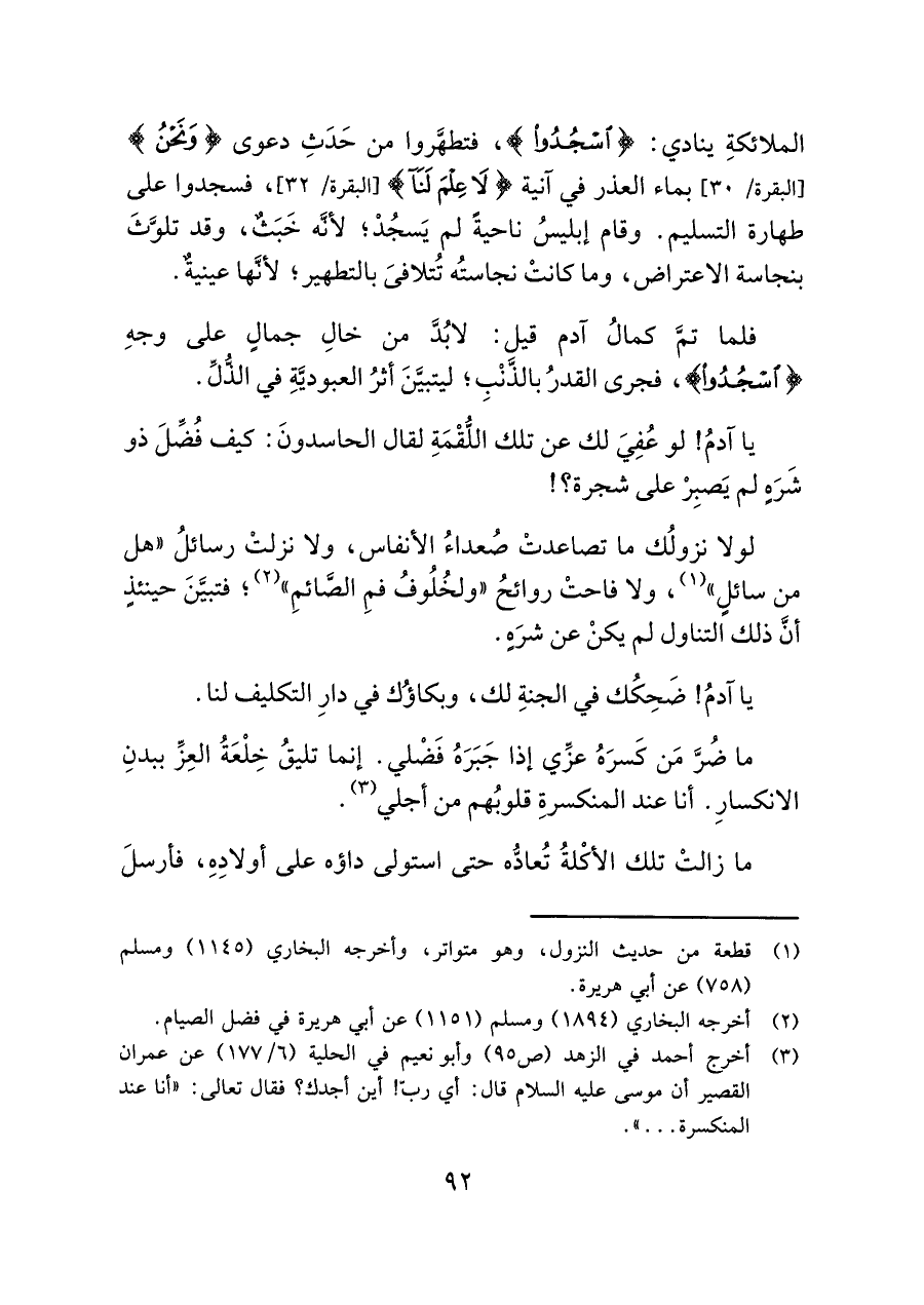 يا آدمُ! لو عُفِيَ لك عن تلك اللُّقْمَةِ لقال الحاسدونَ: كيف فُضِّلَ ذو شَرَهٍ لم يَصبِرْ على شجرة؟!
