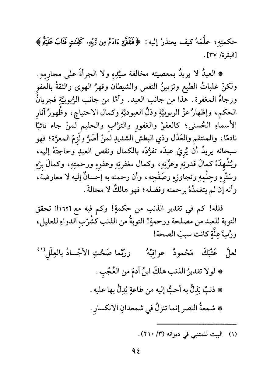 فلله! كم في تقدير الذنب من حكمةٍ! وكم فيه مع تحقق التوبة للعبد من مصلحة ورحمةٍ! التوبةُ من الذنب كشُرْبِ الدواءِ للعليل، ورُبَّ عِلّةٍ كانت سببَ الصحة!
