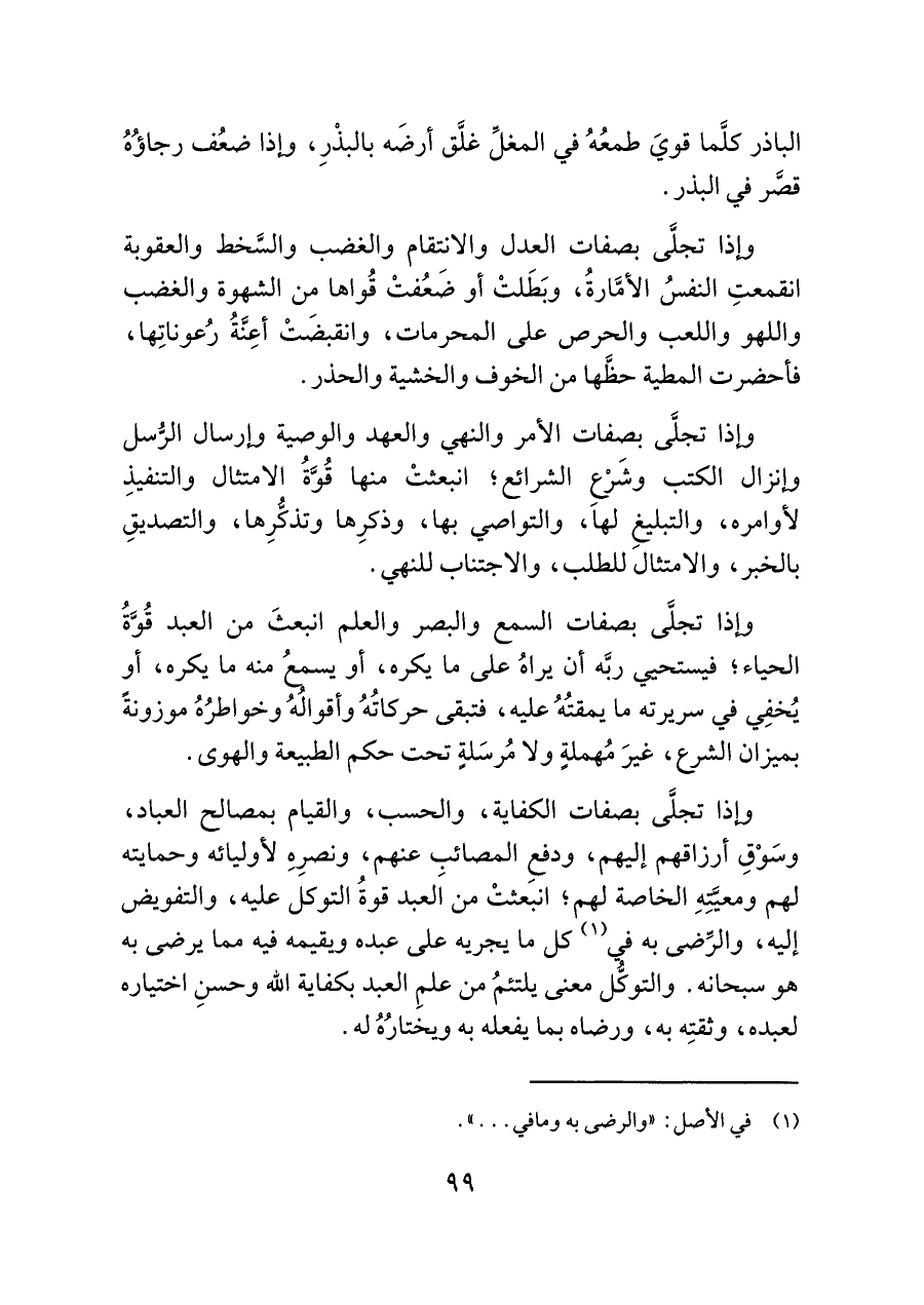 وإذا تجلَّى بصفات الأمر والنهي والعهد والوصية وإرسال الرُّسل وإنزال الكتب وشَرْعِ الشرائع؛ انبعثتْ منها قُوَّةُ الامتثال والتنفيذِ لأوامره، والتبليغِ لها، والتواصي بها، وذكرِها وتذكُّرِها، والتصديقِ بالخبر، والامتثال للطلب، والاجتناب للنهي.