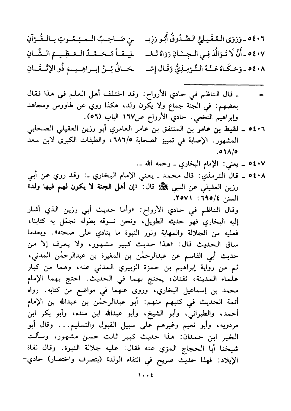 وقال الناظم في حادي الأرواح: "وأما حديث أبي رزين الذي أشار إليه البخاري فهو حديثه الطويل، ونحن نسوقه بطوله نجمّل به كتابنا، فعليه من الجلالة والمهابة ونور النبوة ما ينادي على صحته". وبعدما ساق الحديث قال: "هذا حديث كبير مشهور، ولا يعرف إلا من حديث أبي القاسم عن عبد الرحمن بن المغيرة بن عبد الرحمن المدني، ثم من رواية إبراهيم بن حمزة الزبيري المدني عنه، وهما من كبار علماء المدينة، ثقتان، يحتج بهما في الحديث. احتج بهما الإمام محمد بن إسماعيل البخاري، وروى عنهما في مواضع من كتابه. رواه أئمة الحديث في كتبهم منهم: أبو عبد الرحمن بن عبد الله بن الإمام أحمد، والطبراني، وأبو الشيخ، وأبو عبد الله بن منده، وأبو بكر بن مردويه، وأبو نعيم وغيرهم على سبيل القبول والتسليم ... وقال أبو الخير بن حمدان: هذا حديث كبير ثابت حسن مشهور، وسألت شيخنا أبا الحجاج المزي عنه فقال: عليه جلالة النبوة. وقال نفاة الإيلاد: فهذا حديث صريح في انتفاء الولد" (بتصرف واختصار) حادي =