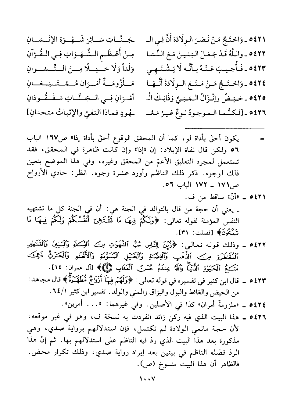 ٥٤٢٥ - حَيْضٌ وإنْزَالُ المَنِيِّ وَذَانِكَ الْـ ... أمْرَانِ فِي الجَنَّاتِ مَفْقُودَانِ