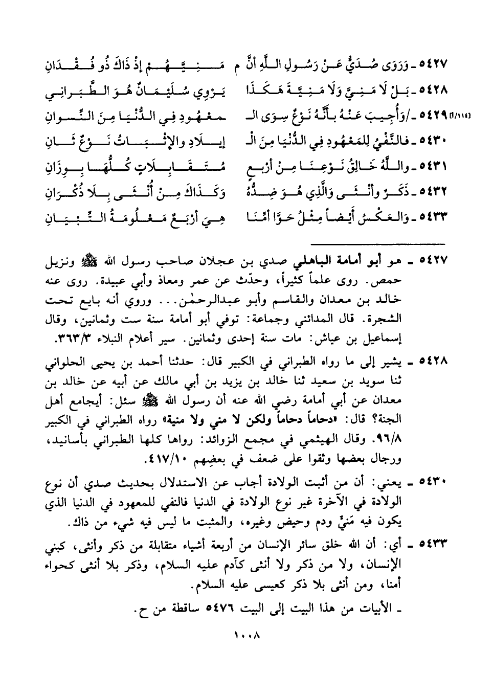 ٥٤٢٨ - يشير إلى ما رواه الطبراني في الكبير قال: حدثنا أحمد بن يحيى الحلواني ثنا سويد بن سعيد ثنا خالد بن يزيد بن أبي مالك عن أبيه عن خالد بن معدان عن أبي أمامة رضي الله عنه أن رسول الله - صلى الله عليه وسلم - سئل: أيجامع أهل الجنة؟ قال: "دحامًا دحامًا ولكن لا مني ولا منية" رواه الطبراني في الكبير ٨/ ٩٦. وقال الهيثمي في مجمع الزوائد: رواها كلها الطبراني بأسانيد، ورجال بعضها وثقوا على ضعف في بعضِهم ١٠/ ٤١٧.