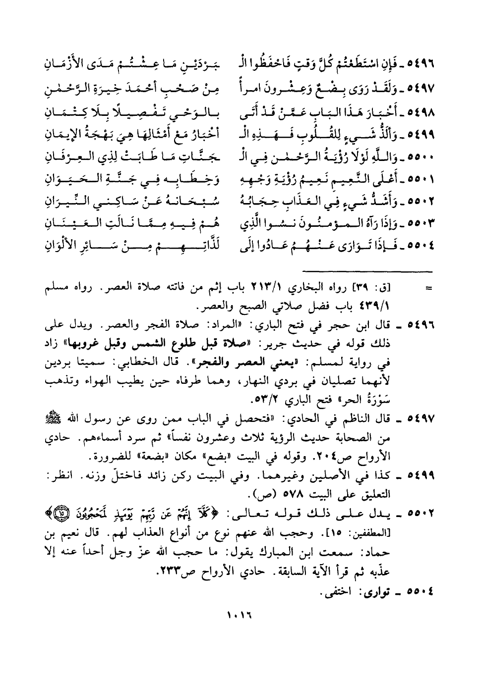 ٥٤٩٧ - قال الناظم في الحادي: "فتحصل في الباب ممن روى عن رسول الله - صلى الله عليه وسلم - من الصحابة حديث الرؤية ثلاث وعشرون نفسا" ثم سرد أسماءهم. حادي الأرواح ص ٢٠٤. وقوله في البيت "بضع" مكان "بضعة" للضرورة.