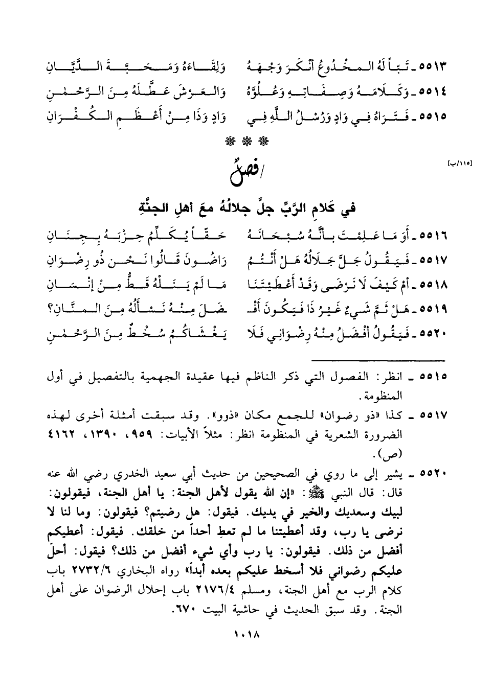 ٥٥١٧ - كذا "ذو رضوان" للجمع مكان "ذوو". وقد سبقت أمثلة أخرى لهذه الضرورة الشعرية في المنظومة انظر: مثلًا الأبيات: ٩٥٩، ١٣٩٠، ٤١٦٢ (ص).