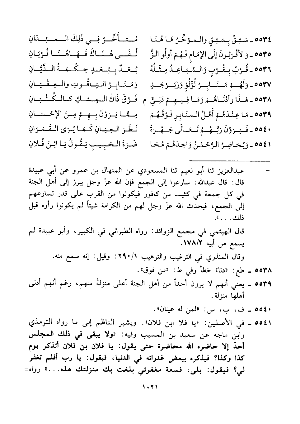 ٥٥٣٩ - يعني أنهم لا يرون أحدًا من أهل الجنة أعلى منزلةً منهم، رغم أنهم أدنى أهلها منزلة.