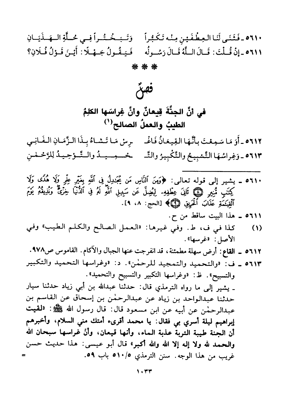 ٥٦١٣ - وَغِراسُهَا التَّسْبِيحُ والتكْبِيرُ والتَّـ ... حْمِيدُ والتَّوحِيدُ لِلرَّحْمنِ