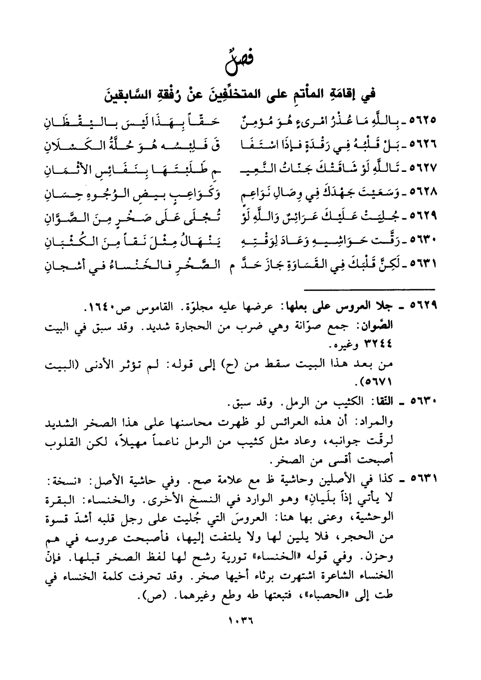 ٥٦٣١ - كذا في الأصلين وحاشية ظ مع علامة صح. وفي حاشية الأصل: "نسخة: لا يأتي إذًا بلَيانِ" وهو الوارد في النسخ الأخرى. والخنساء: البقرة الوحشية، وعنى بها هنا: العروسَ التي جُليت على رجل قلبه أشدّ قسوة من الحجر، فلا يلين لها ولا يلتفت إليها، فأصبحت عروسه في هم وحزن. وفي قوله "الخنساء" تورية رشح لها لفظ الصخر قبلها. فإنّ الخنساء الشاعرة اشتهرت برثاء أخيها صخر. وقد تحرفت كلمة الخنساء في طت إلى "الحصباء"، فتبعتها طه وطع وغيرهما. (ص).