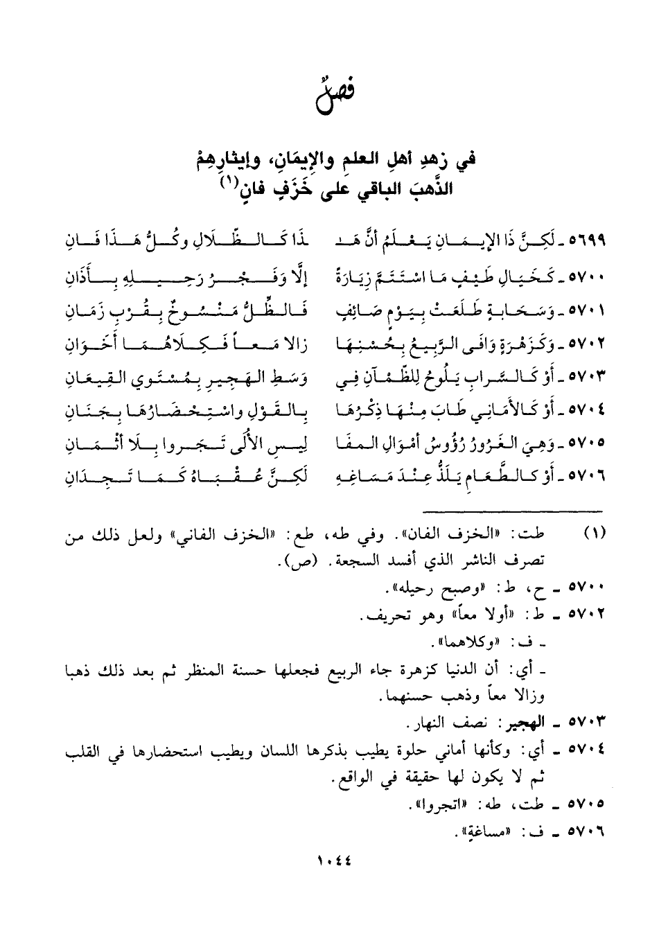 ٥٦٩٩ - لَكِنَّ ذَا الإيمَانِ يَعْلَمُ أنَّ هَـ ... ـذا كَالظّلَالِ وكُلُّ هَذَا فَانِ
