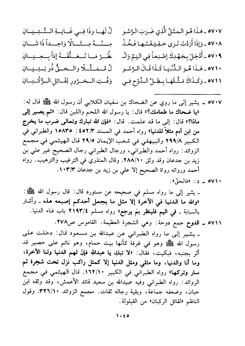 ٥٧٠٧ - يشير إلى ما روي عن الضحاك بن سفيان الكلابي أن رسول الله - صلى الله عليه وسلم - قال له: "يا ضحاك ما طعامك؟ " قال: يا رسول الله اللحم واللبن قال: "ثم يصير إلى ماذا؟ " قال: إلى ما قد علمت. قال: "فإن الله تبارك وتعالى ضرب ما يخرج من ابن آدم مثلًا للدنيا" رواه أحمد في المسند ٣/ ٤٥٢: ١٥٨٣٥ والطبراني في الكبير ٨/ ٢٩٩ والبيهقي في شعب الإيمان ٥/ ٢٩ قال الهيثمي في مجمع الزوائد: رواه أحمد والطبراني، ورجال الطبراني رجال الصحيح غير علي بن زيد بن جدعان وقد وثق. ١/ ٢٨٨. وقال المنذري في الترغيب والترهيب. رواه أحمد ورواته رواة الصحيح إلا علي بن زيد بن جدعان ٣/ ١٠٣.
