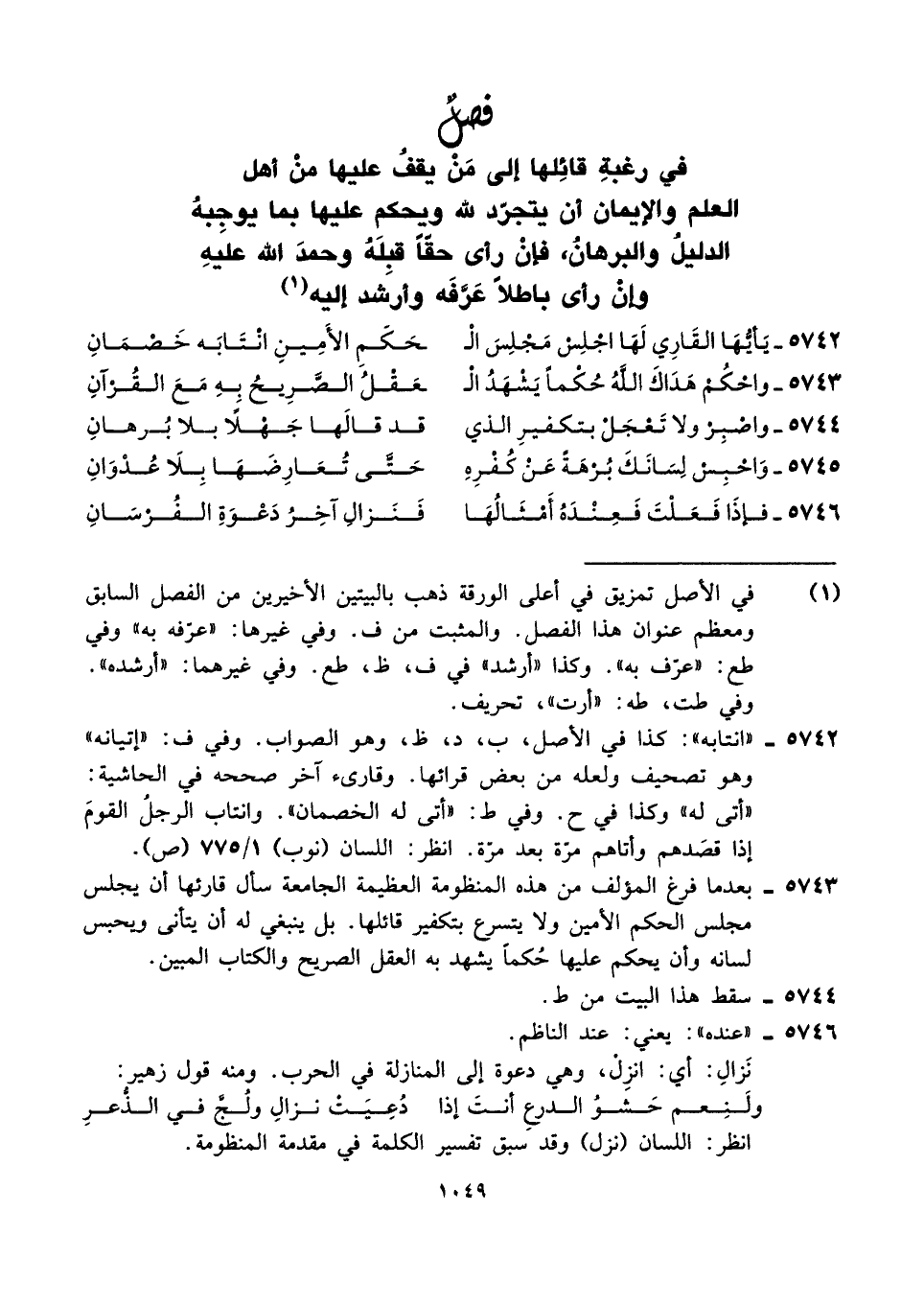 ٥٧٤٣ - بعدما فرغ المؤلف من هذه المنظومة العظيمة الجامعة سأل قارئها أن يجلس مجلس الحكم الأمين ولا يتسرع بتكفير قائلها. بل ينبغي له أن يتأنى ويحبس لسانه وأن يحكم عليها حُكمًا يشهد به العقل الصريح والكتاب المبين.