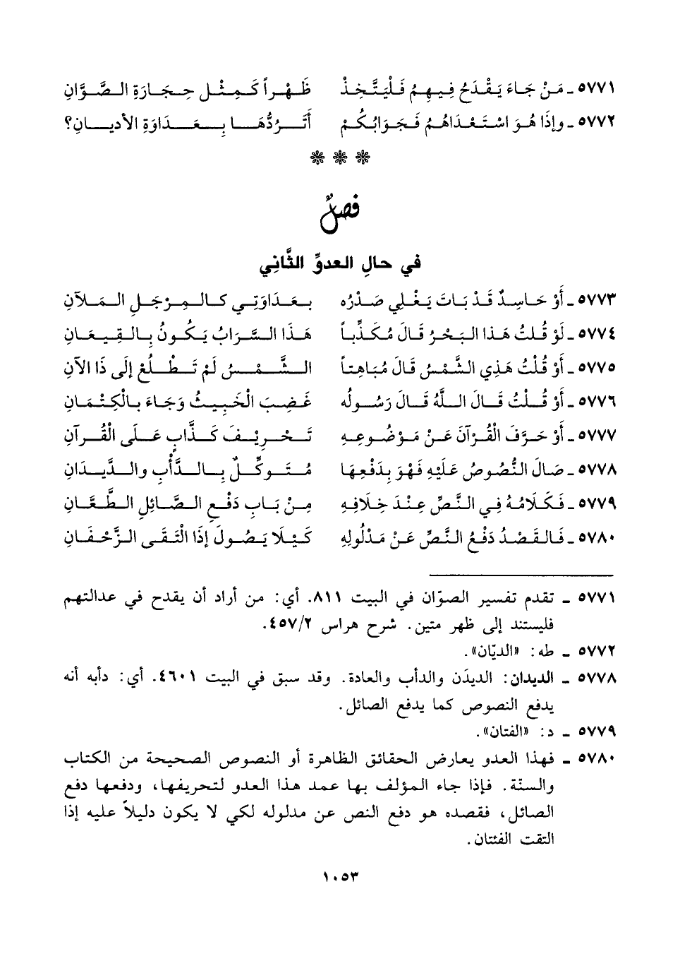 ٥٧٧١ - تقدم تفسير الصوّان في البيت ٨١١. أي: من أراد أن يقدح في عدالتهم فليستند إلى ظهر متين. شرح هراس ٢/ ٤٥٧.