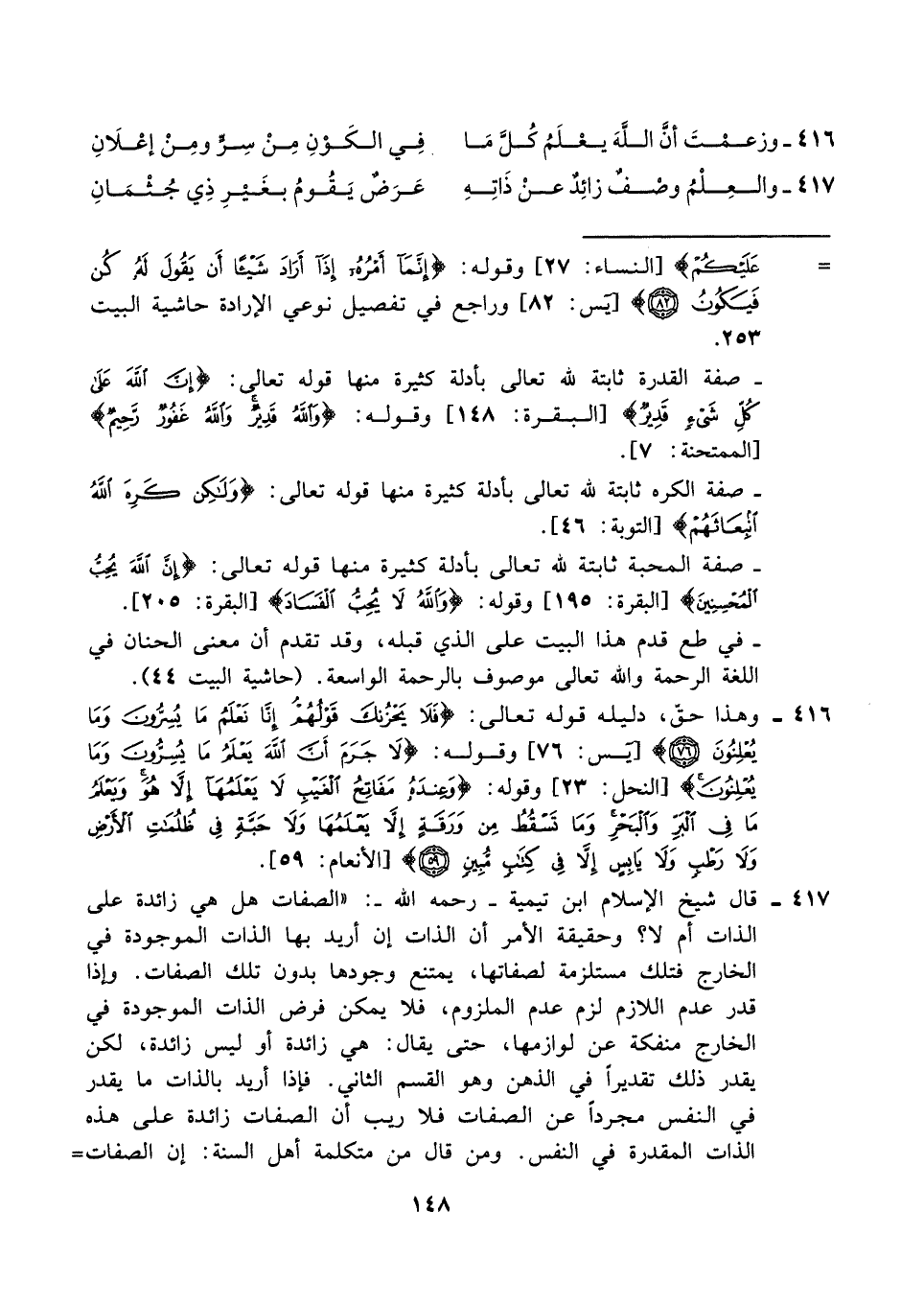 ٤١٦ - وهذا حقّ، دليله قوله تعالى: {فَلَا يَحْزُنْكَ قَوْلُهُمْ إِنَّا نَعْلَمُ مَا يُسِرُّونَ وَمَا يُعْلِنُونَ (٧٦)} [يس: ٧٦] وقوله: {لَا جَرَمَ أَنَّ اللَّهَ يَعْلَمُ مَا يُسِرُّونَ وَمَا يُعْلِنُونَ} [النحل: ٢٣] وقوله: {وَعِنْدَهُ مَفَاتِحُ الْغَيْبِ لَا يَعْلَمُهَا إِلَّا هُوَ وَيَعْلَمُ مَا فِي الْبَرِّ وَالْبَحْرِ وَمَا تَسْقُطُ مِنْ وَرَقَةٍ إِلَّا يَعْلَمُهَا وَلَا حَبَّةٍ فِي ظُلُمَاتِ الْأَرْضِ وَلَا رَطْبٍ وَلَا يَابِسٍ إِلَّا فِي كِتَابٍ مُبِينٍ (٥٩)} [الأنعام: ٥٩].