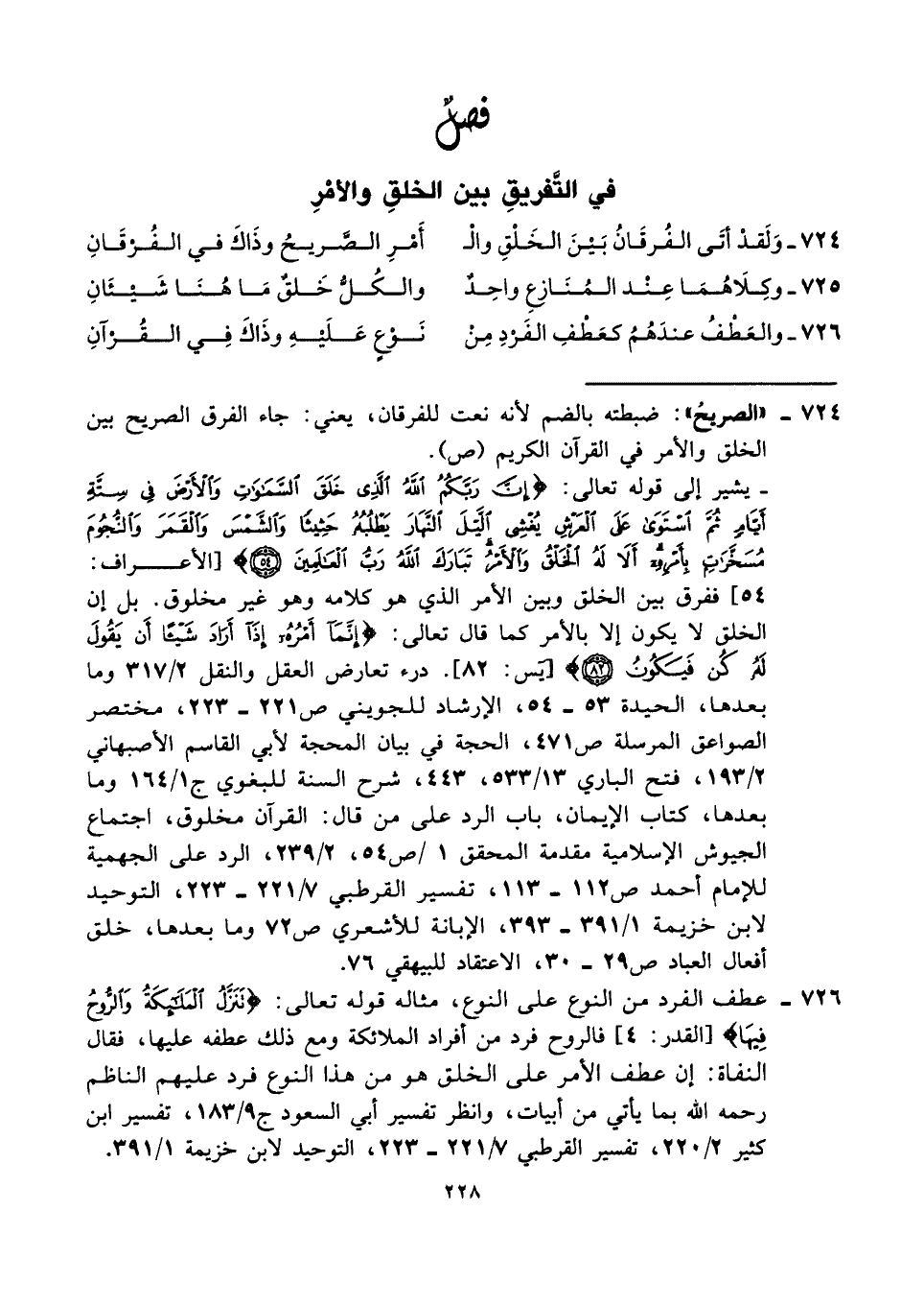- يشير إلى قوله تعالى: {إِنَّ رَبَّكُمُ اللَّهُ الَّذِي خَلَقَ السَّمَاوَاتِ وَالْأَرْضَ فِي سِتَّةِ أَيَّامٍ ثُمَّ اسْتَوَى عَلَى الْعَرْشِ يُغْشِي اللَّيْلَ النَّهَارَ يَطْلُبُهُ حَثِيثًا وَالشَّمْسَ وَالْقَمَرَ وَالنُّجُومَ مُسَخَّرَاتٍ بِأَمْرِهِ أَلَا لَهُ الْخَلْقُ وَالْأَمْرُ تَبَارَكَ اللَّهُ رَبُّ الْعَالَمِينَ (٥٤)} [الأعراف: ٥٤] ففرق بين الخلق وبين الأمر الذي هو كلامه وهو غير مخلوق. بل إن الخلق لا يكون إلا بالأمر كما قال تعالى {إِنَّمَا أَمْرُهُ إِذَا أَرَادَ شَيْئًا أَنْ يَقُولَ لَهُ كُنْ فَيَكُونُ (٨٢)} [يس: ٨٢]. درء تعارض العقل والنقل ٢/ ٣١٧ وما بعدها، الحيدة ٥٣ - ٥٤، الإرشاد للجويني ص ٢٢١ - ٢٢٣، مختصر الصواعق المرسلة ص ٤٧١، الحجة في بيان المحجة لأبي القاسم الأصبهاني ٢/ ١٩٣، فتح الباري ١٣/ ٥٣٣، ٤٤٣، شرح السنة للبغوي ج ١/ ١٦٤ وما بعدها، كتاب الإيمان، باب الرد على من قال: القرآن مخلوق، اجتماع الجيوش الإسلامية مقدمة المحقق ١/ ص ٥٤، ٢/ ٢٣٩، الرد على الجهمية للإمام أحمد ص ١١٢ - ١١٣، تفسير القرطبي ٧/ ٢٢١ - ٢٢٣، التوحيد لابن خزيمة ١/ ٣٩١ - ٣٩٣، الإبانة للأشعري ص ٧٢ وما بعدها، خلق أفعال العباد ص ٢٩ - ٣٠، الاعتقاد للبيهقي ٧٦.